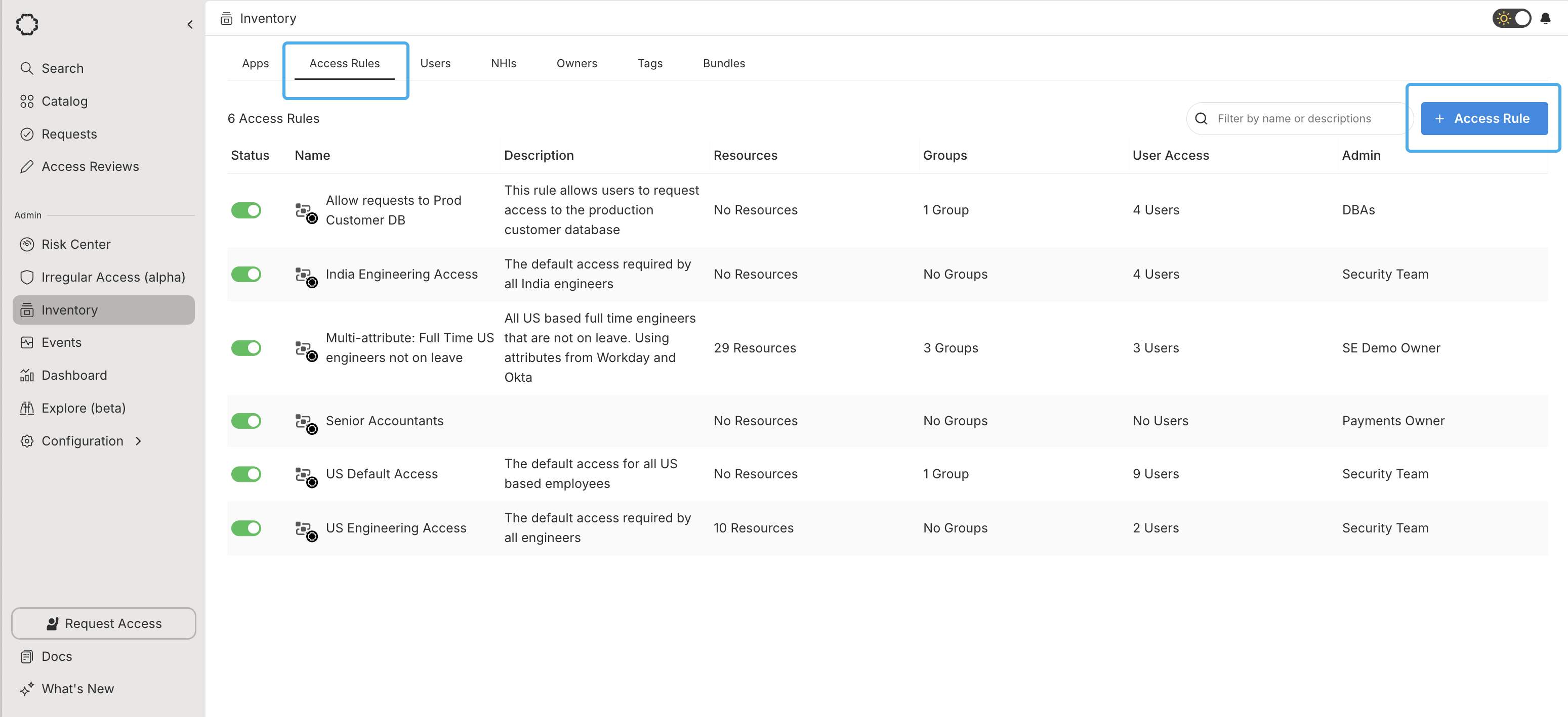 After you create an Access Rule, you can pause it to prevent new users from being added to the rule. Existing users, even if they no longer match the conditions, still have access to any resources or groups granted from the rule. Pause and activate Access Rules by toggling the Status column, either on the Access Rules page or from the detail page.