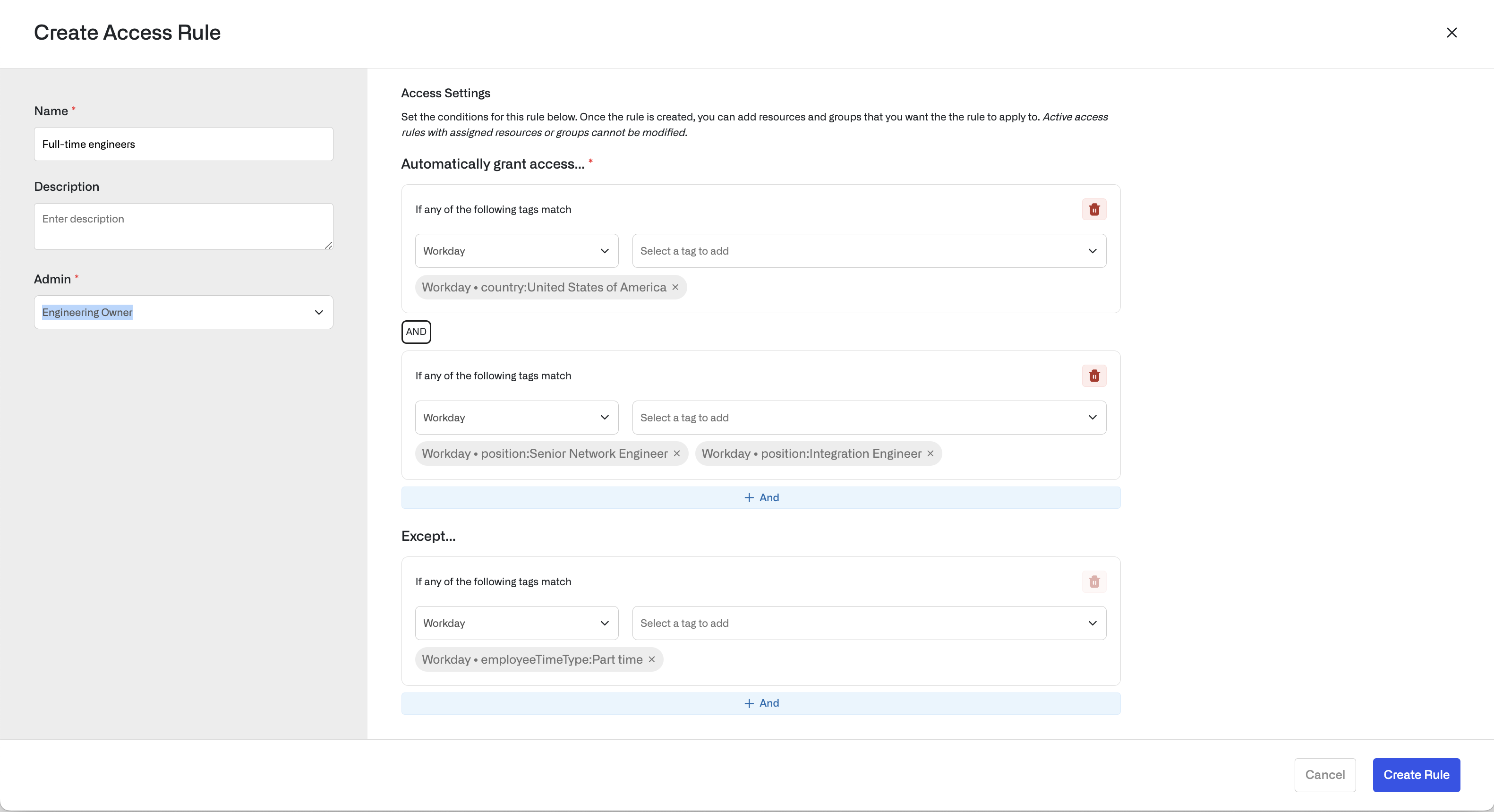 Access Rules consist of conditions, which you use to filter a list of users based on tags imported from your IDP. Conditions use the conjunctive normal form, expressed as an AND of ORs. You can exclude users with the Except… clause. The following example filters users to full-time engineers living in the United States. The condition includes users tagged with Country:United States AND (position:Senior Network Engineer OR position:Integration Engineer), and the Except… clause excludes any users tagged with employeeTimeType:PartTime.