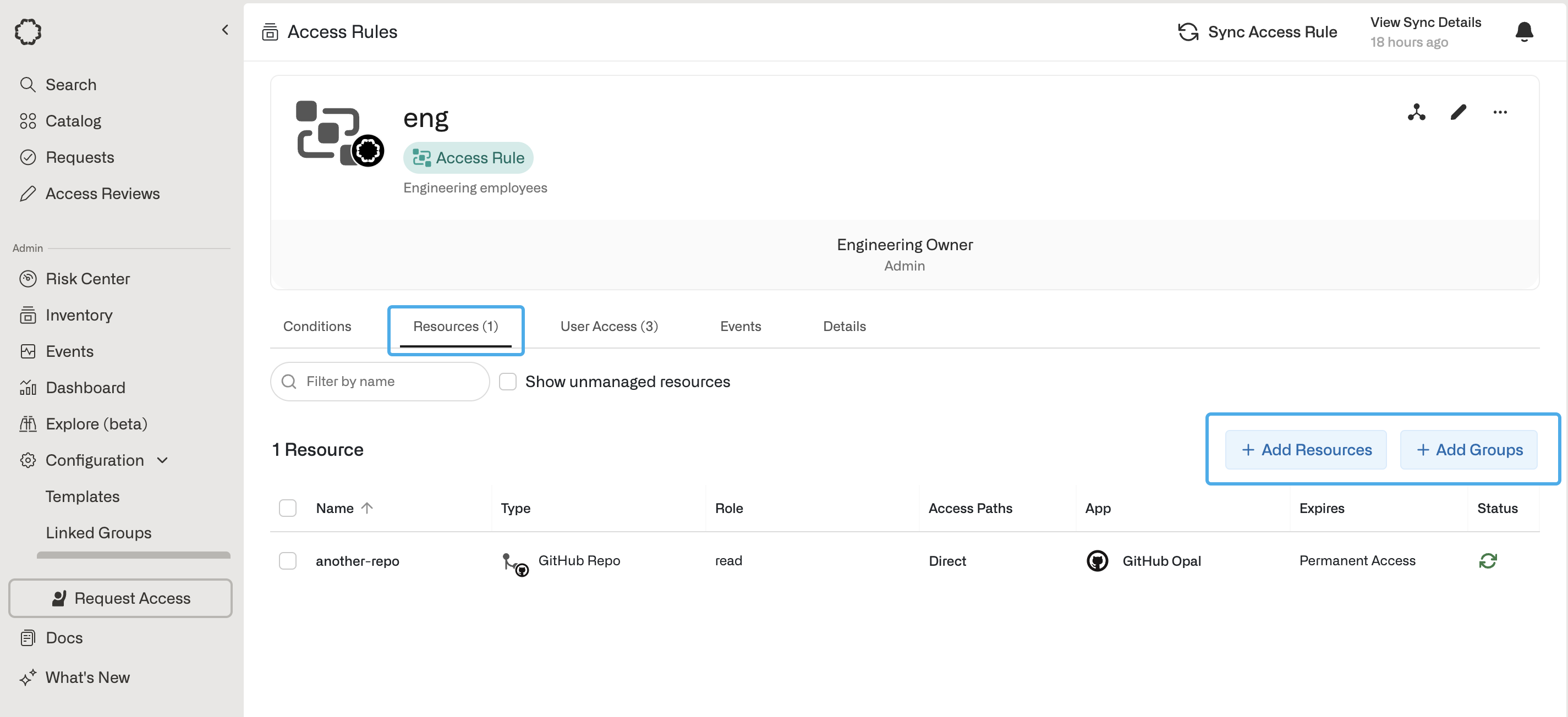 In the Resources tab on your Access Rule, you can grant access to groups and resources as you would for an individual group or user. You can also set the access duration to be indefinite or timebound.