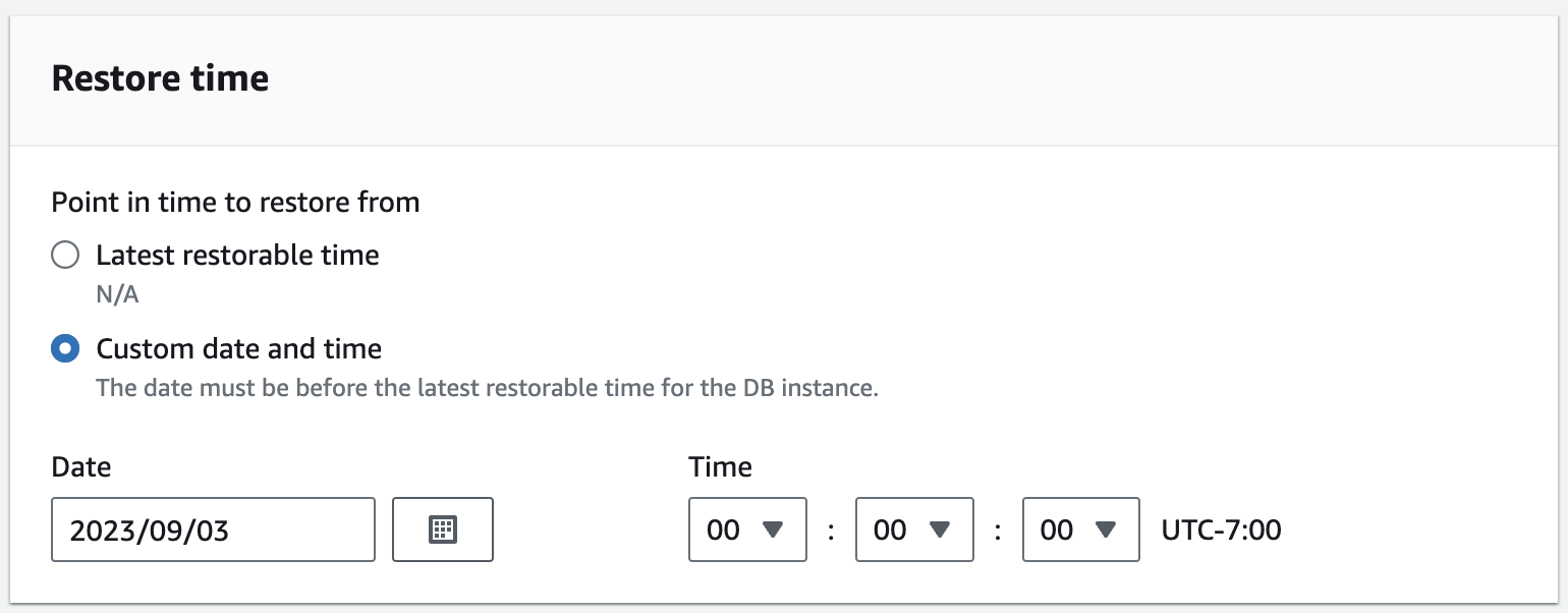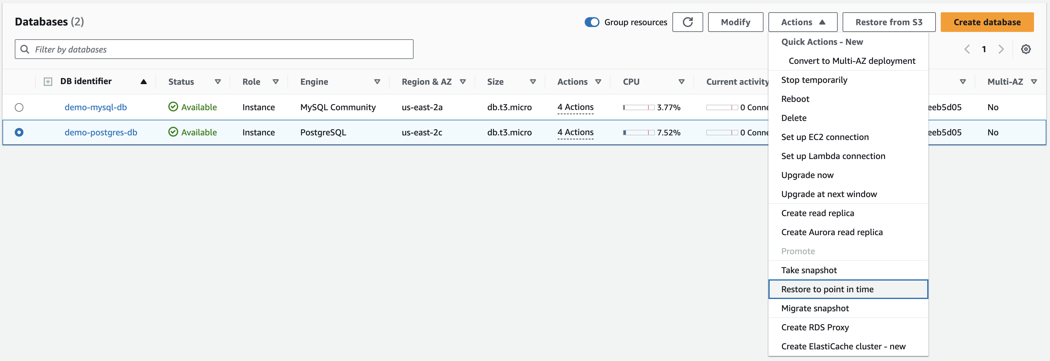 Time estimate: 30 min Here are the steps to restore a database from a backup on Amazon RDS:- Select the database instance, then click the Actions button, then click Restore to point in time.