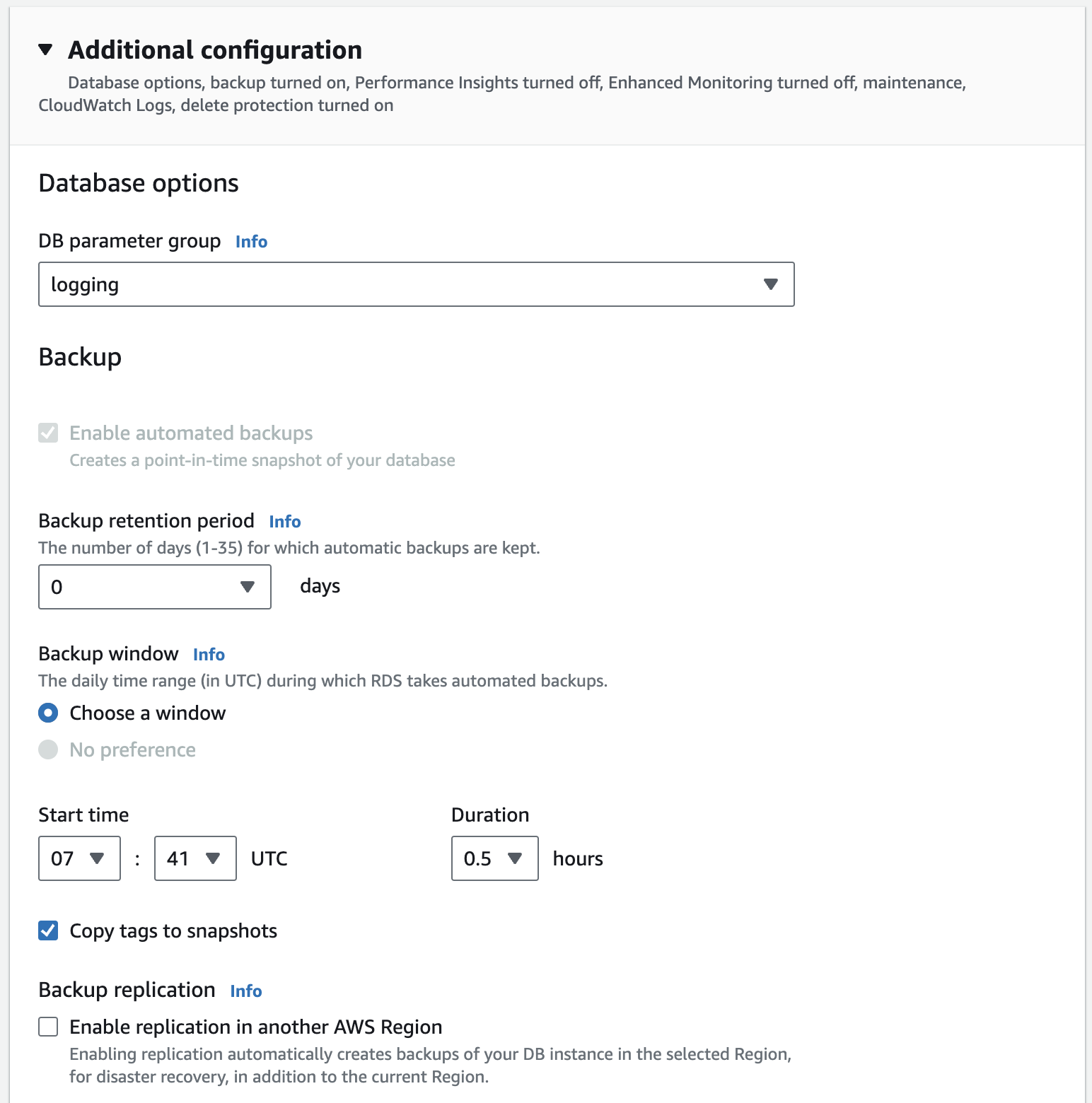 - Navigate to the Additional configuration section and select a Backup retention period. You may also enable Backup replication in another region. This can be helpful in the event of an outage with an entire AWS region. We recommend setting a backup retention period of 30 days.
