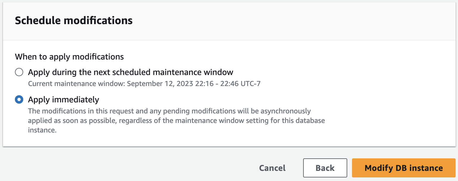 - Click Continue to finish the backup configuration, then you can select Apply immediately. Finally, click Modify DB instance.