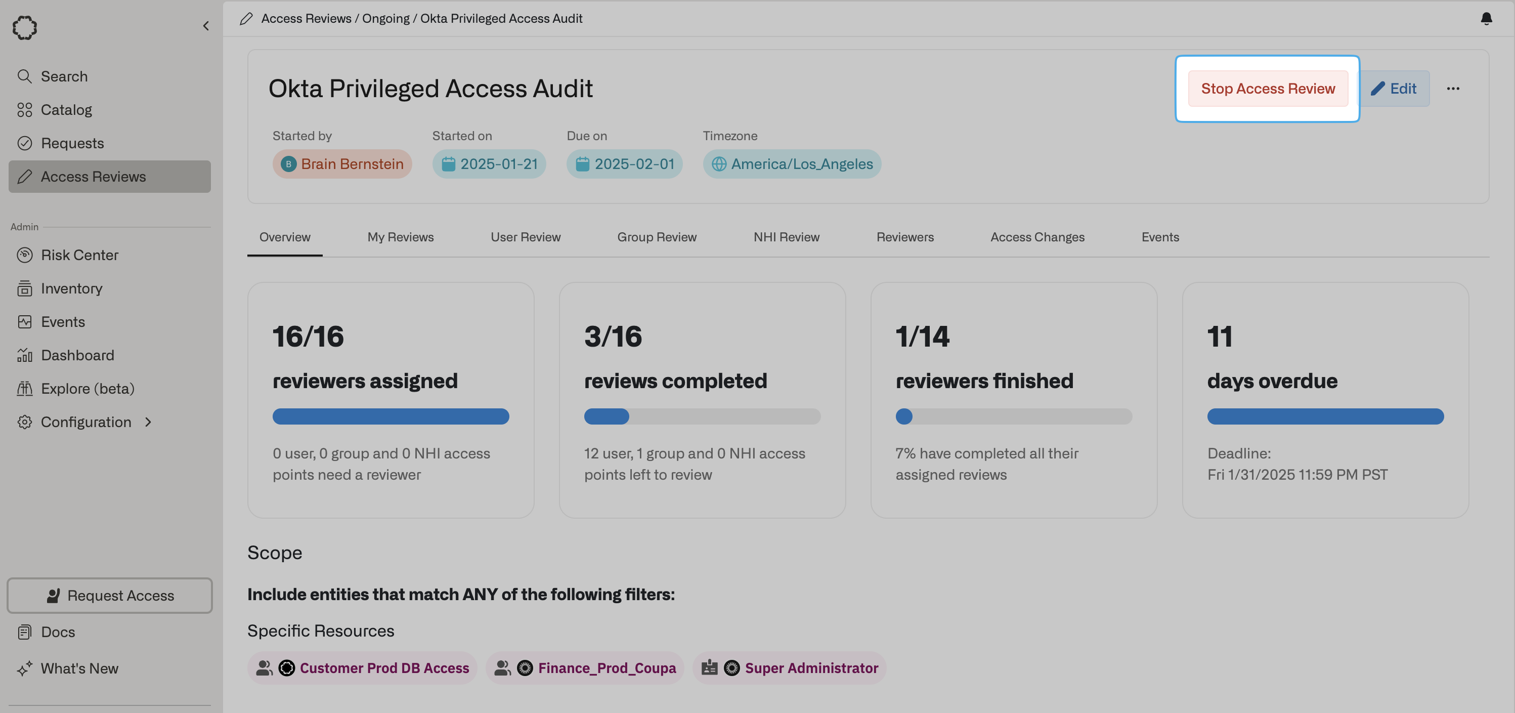 Opal Auditors can select Stop Access Review in the Overview tab. This automatically generates a PDF to summarize metrics and actions taken during the review.