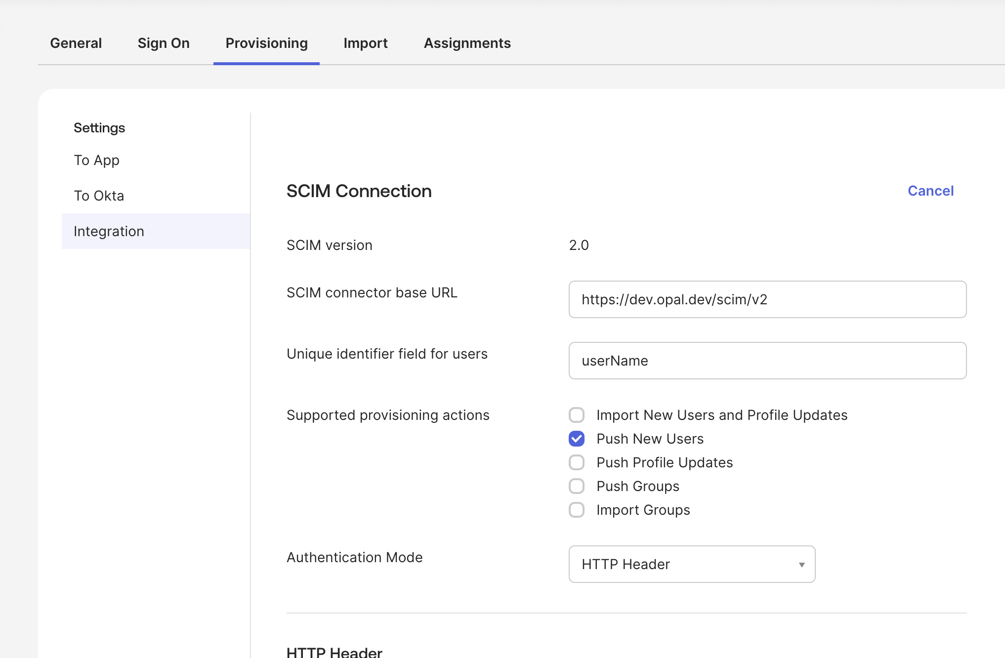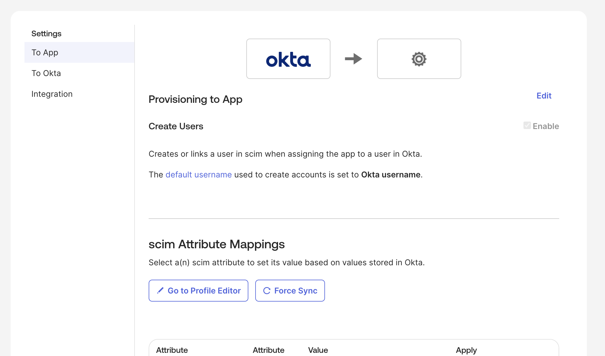 For most use cases, you probably don’t need to use Okta SCIM provisioning. Opal will automatically sync new users and profile updates from Okta.SCIM provisioning is useful if you cannot wait for the hourly or a manual sync to retrieve new users.