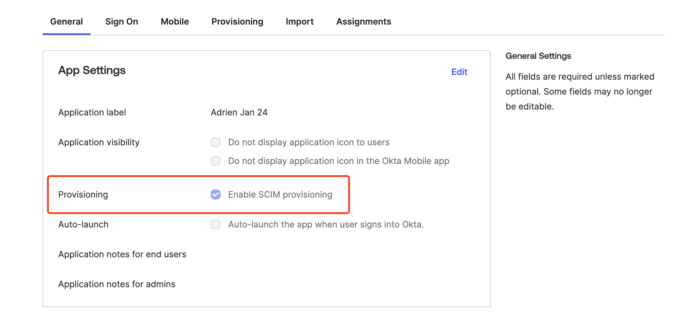 - In Okta, go to Applications and select the Opal application. Under General, ensure Enable SCIM provisioning is selected.