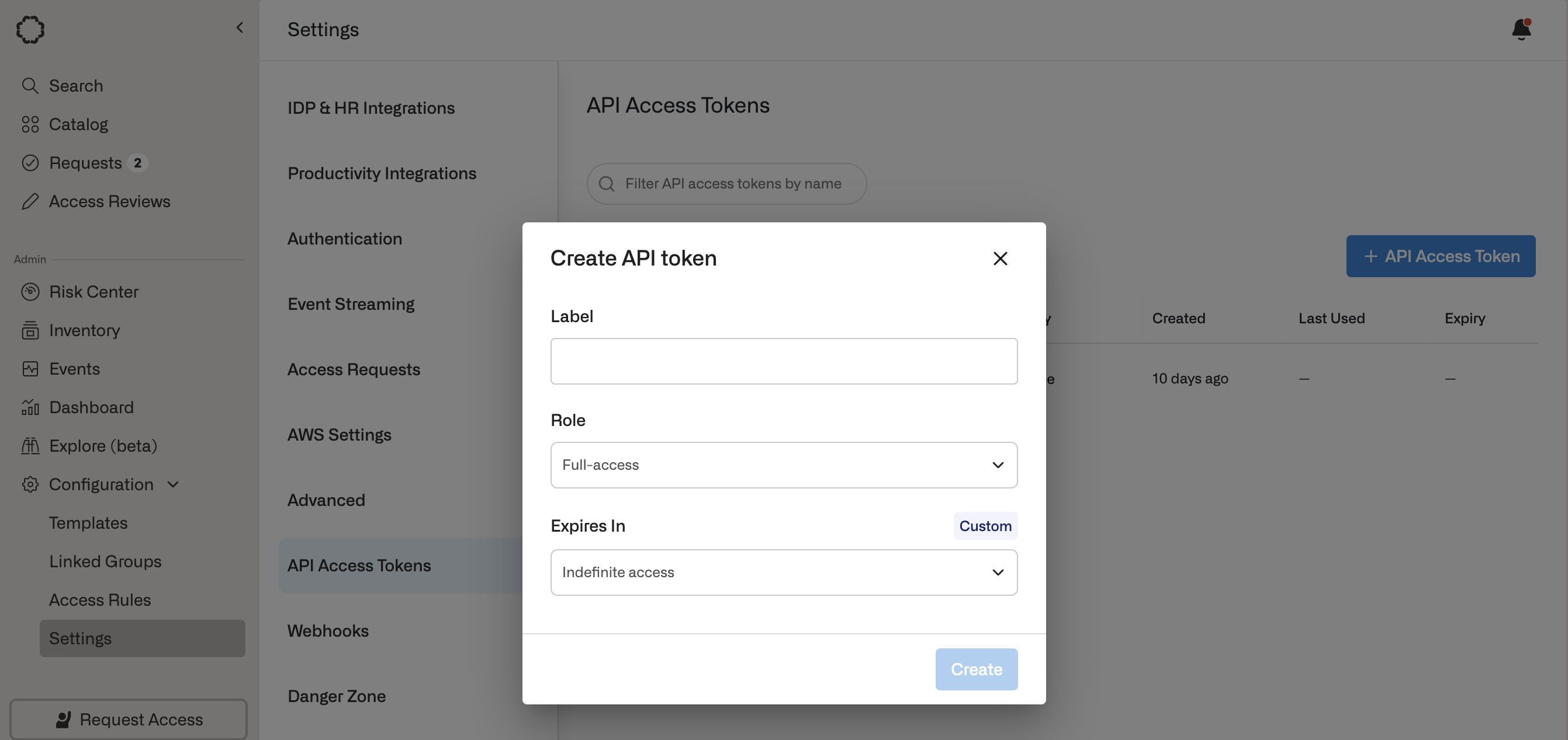 You must first connect Okta as an IDP to use Okta SCIM provisioning. Next, generate an Opal API token with admin level privileges. As an admin, go to Configuration > Settings > API Access Tokens. Select the +API Access Tokens button. Generate a token with the Full-access role: