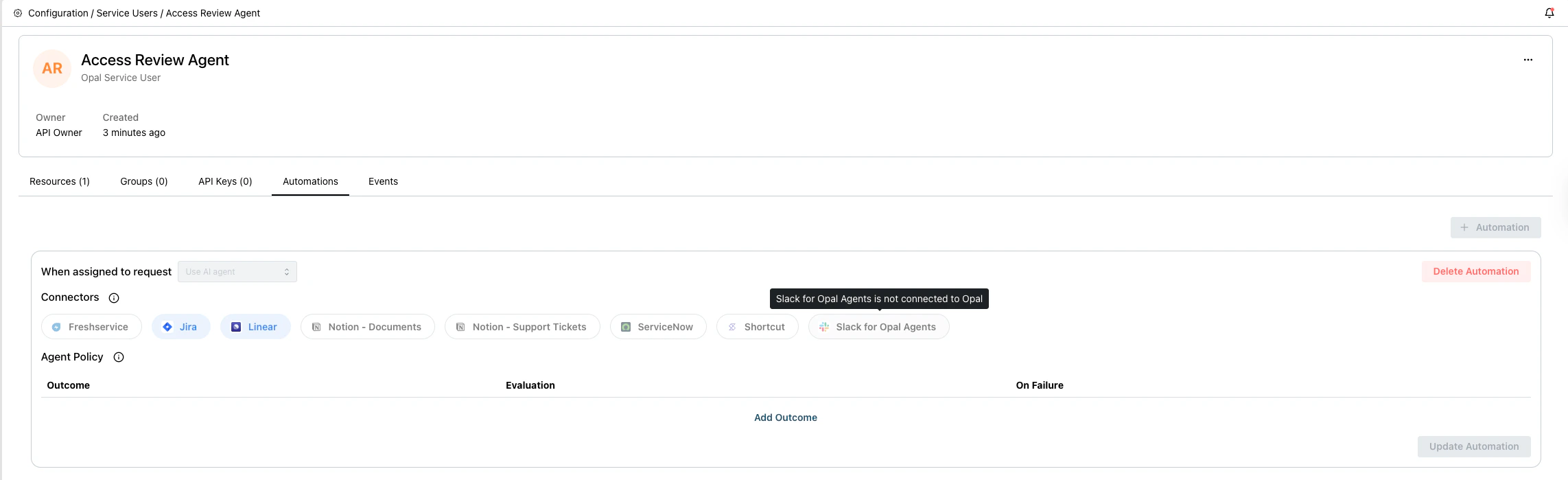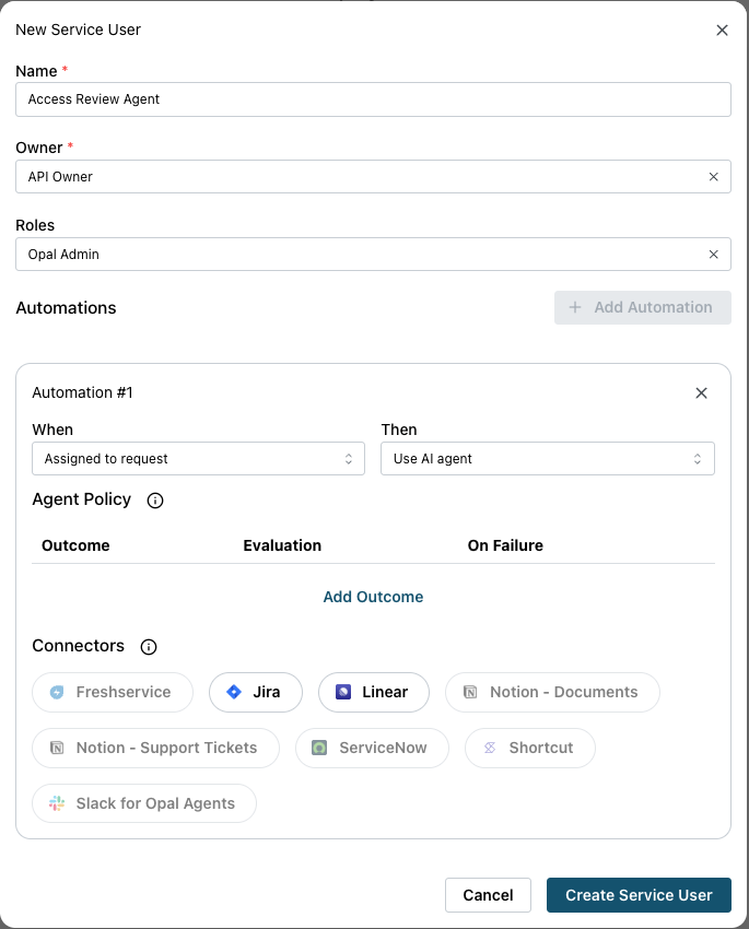 - In Opal, navigate to Configuration > Service Users and create a service user that will represent your agent.