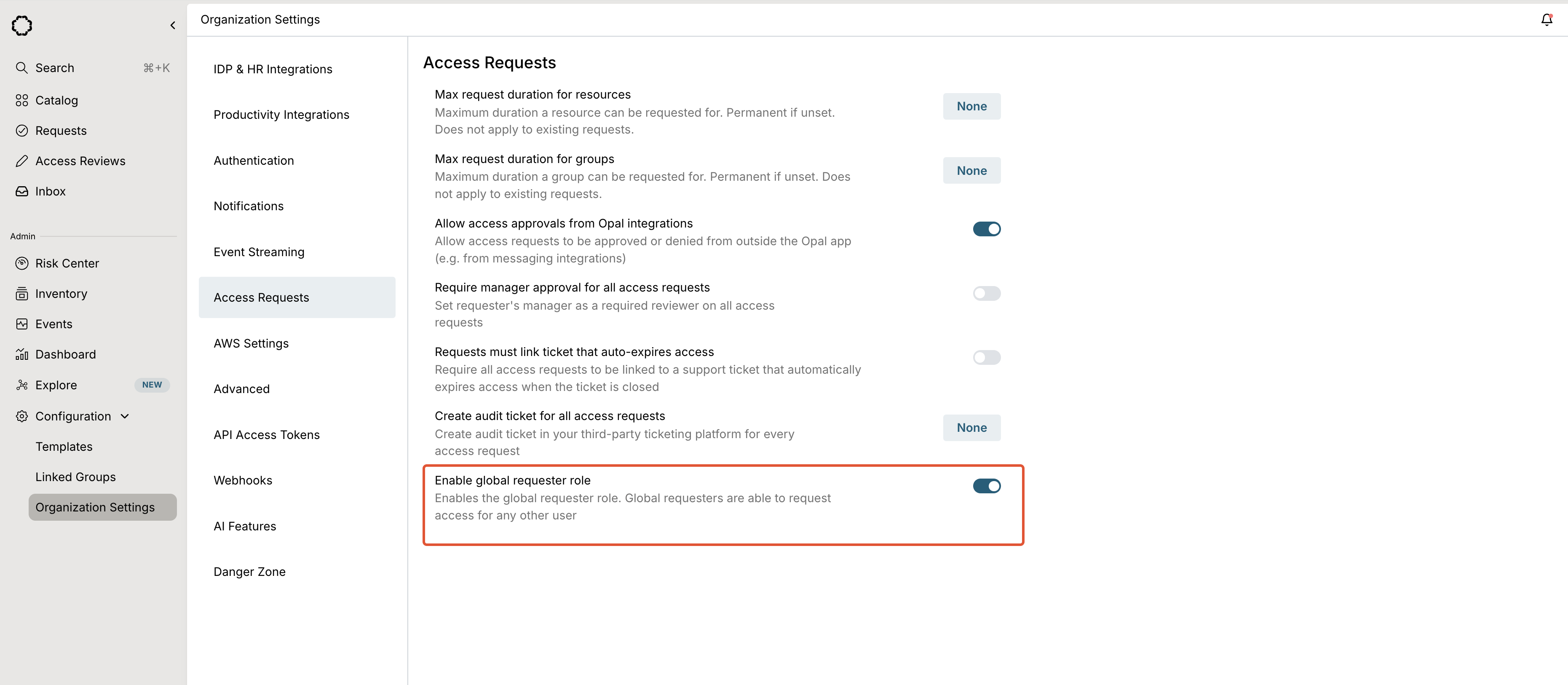 To enable the Global Requestor role, go to Organization Settings > Access Requests and toggle Enable global requestor role. See request on behalf rules to learn about how visibility settings and request configurations affect the global requestor role.