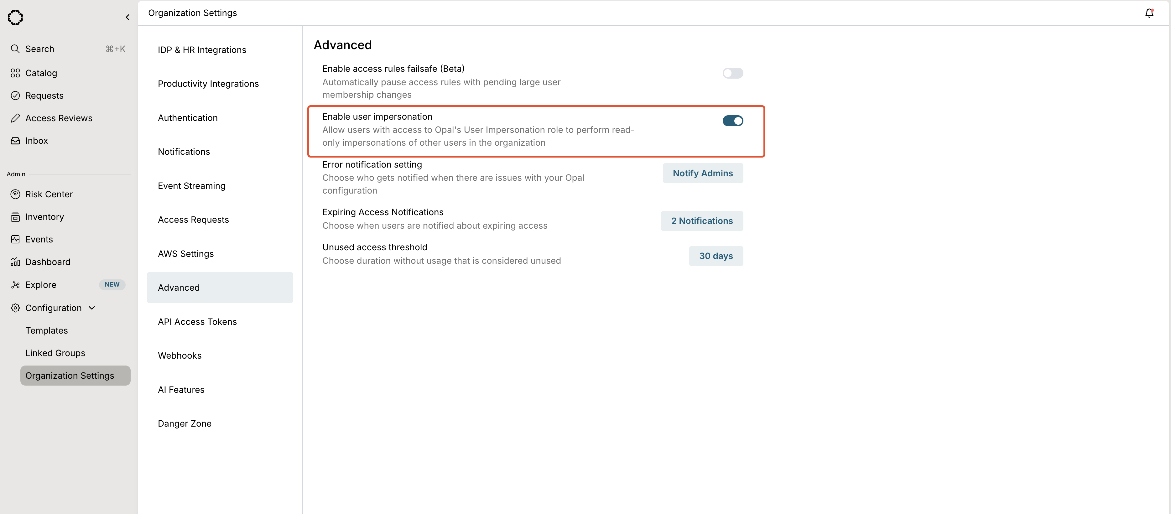 To enable the User Impersonation role, admins can go to Organization Settings > Advanced and toggle Enable user impersonation.