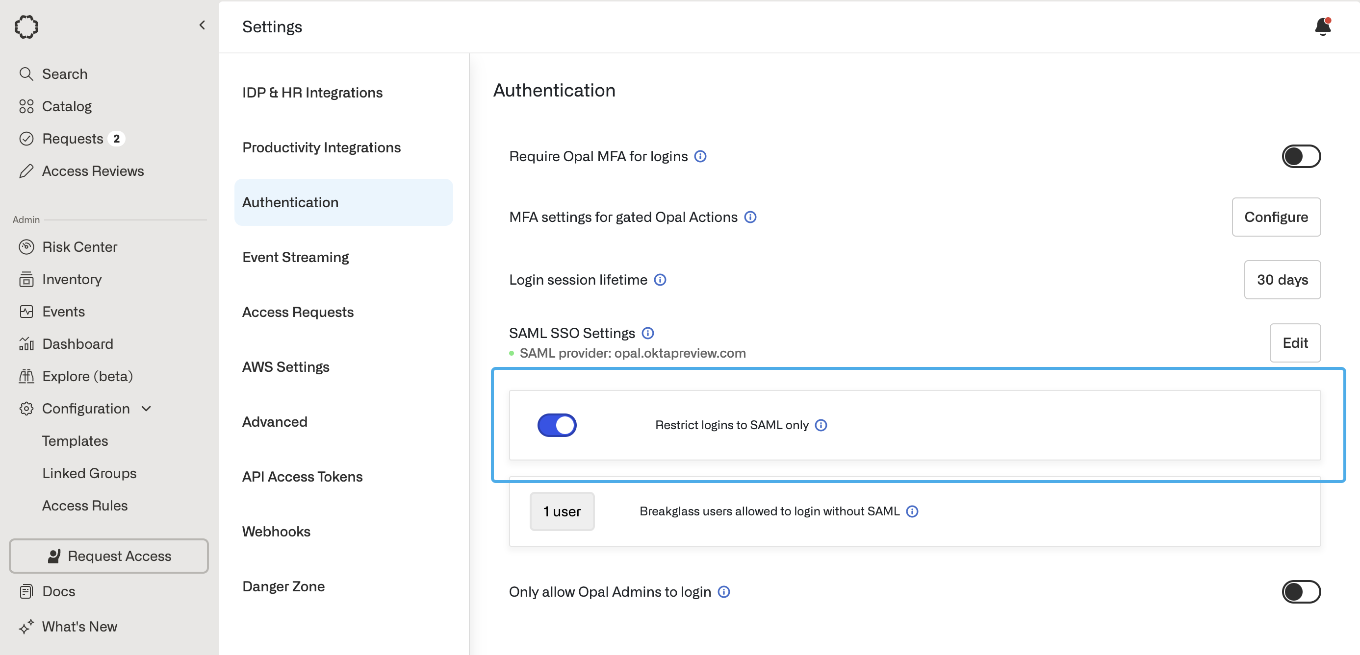 By default, when you set up SAML SSO in Opal, Opal allows users to log in using either SAML SSO or Opal’s traditional sign-in options (e.g. Google, Microsoft 365). You can alternatively require that users must login to Opal via SAML. To do this:- Go to Settings > Authentication > SAML SSO Settings.