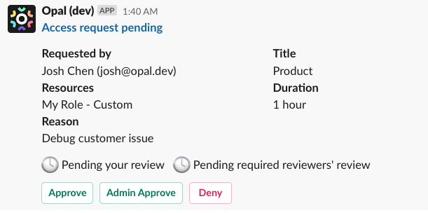 Suppose Josh requests access to a custom resource called My Role. The required reviewers for My Role are notified in Slack that they have a request to review.