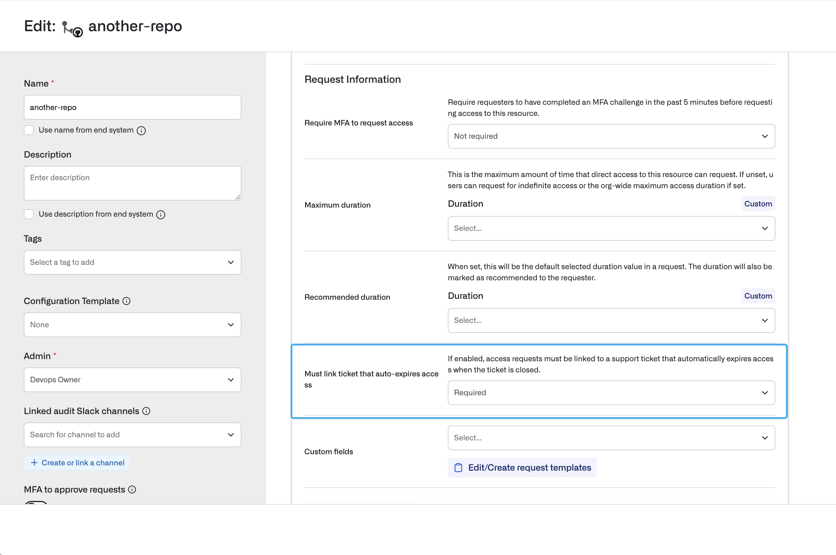 To require users to connect to existing tickets when they request access, first go to the Inventory, then the Edit page for the resource in question. In the Request configuration section under Request Information, set Must link ticket that auto-expires access setting to Required.