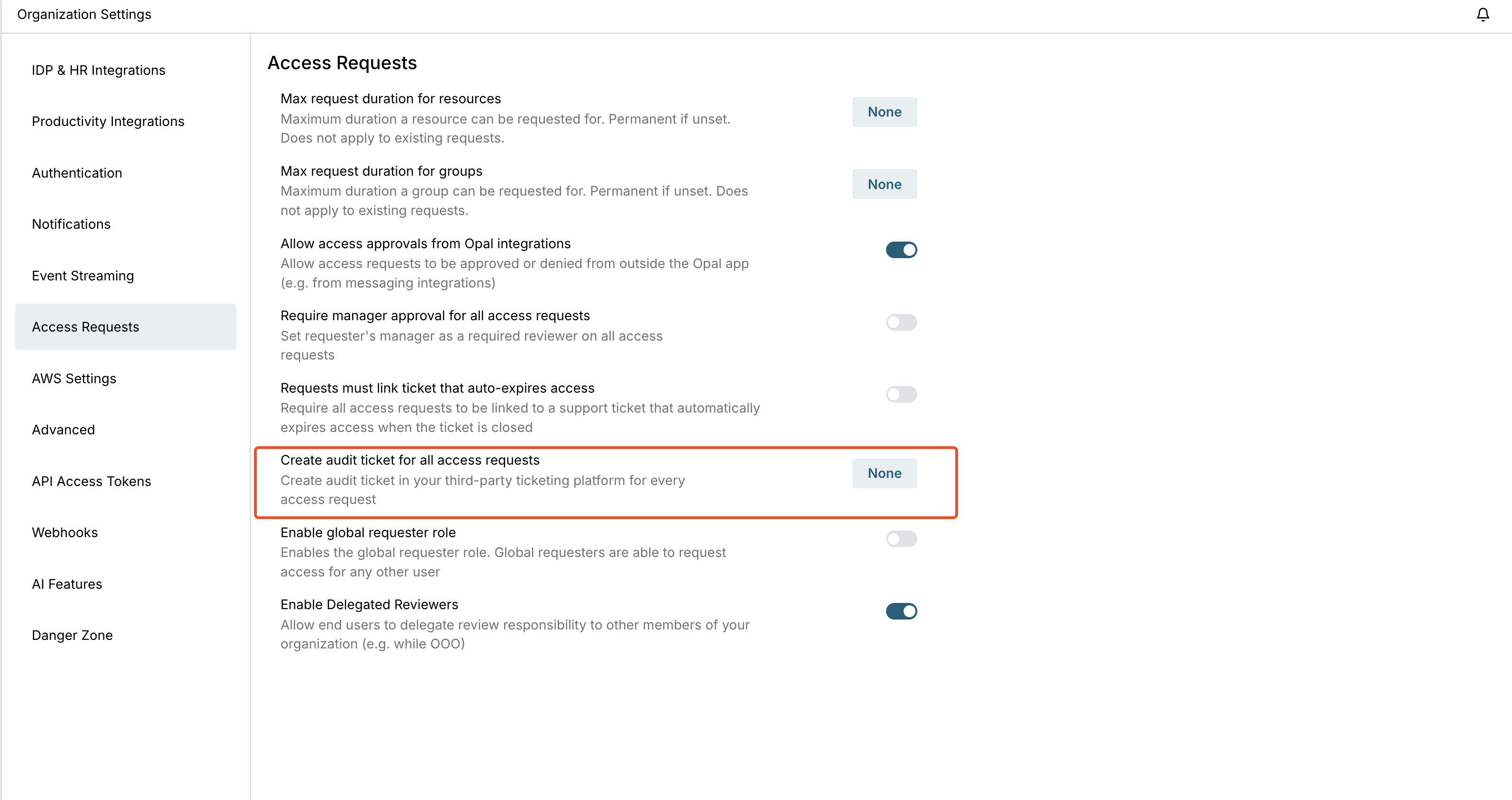 To create an audit ticket for every access request in Opal, go to Settings > Access Requests and select Create audit ticket for all access requests, then enter your ticket provider details.