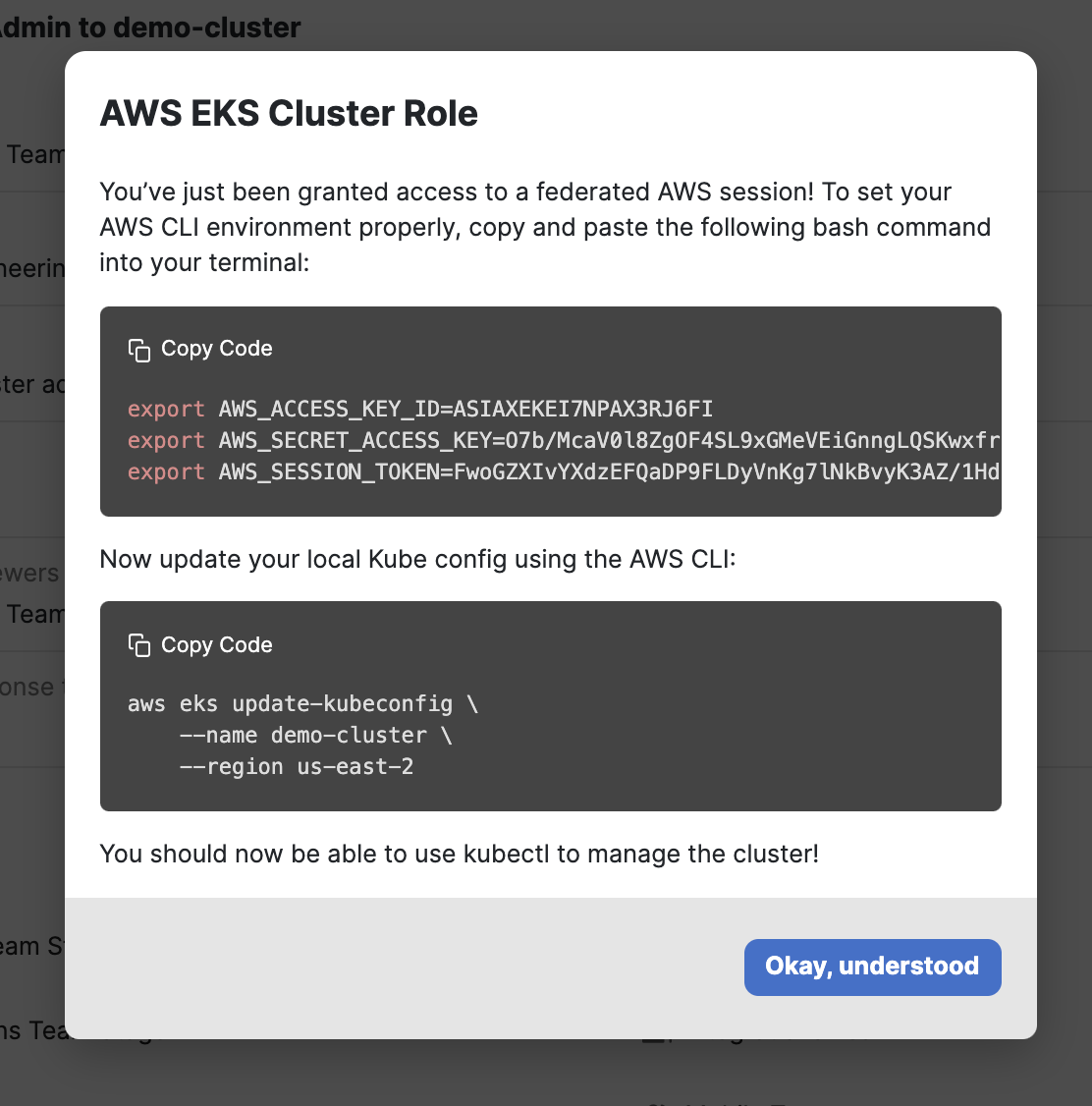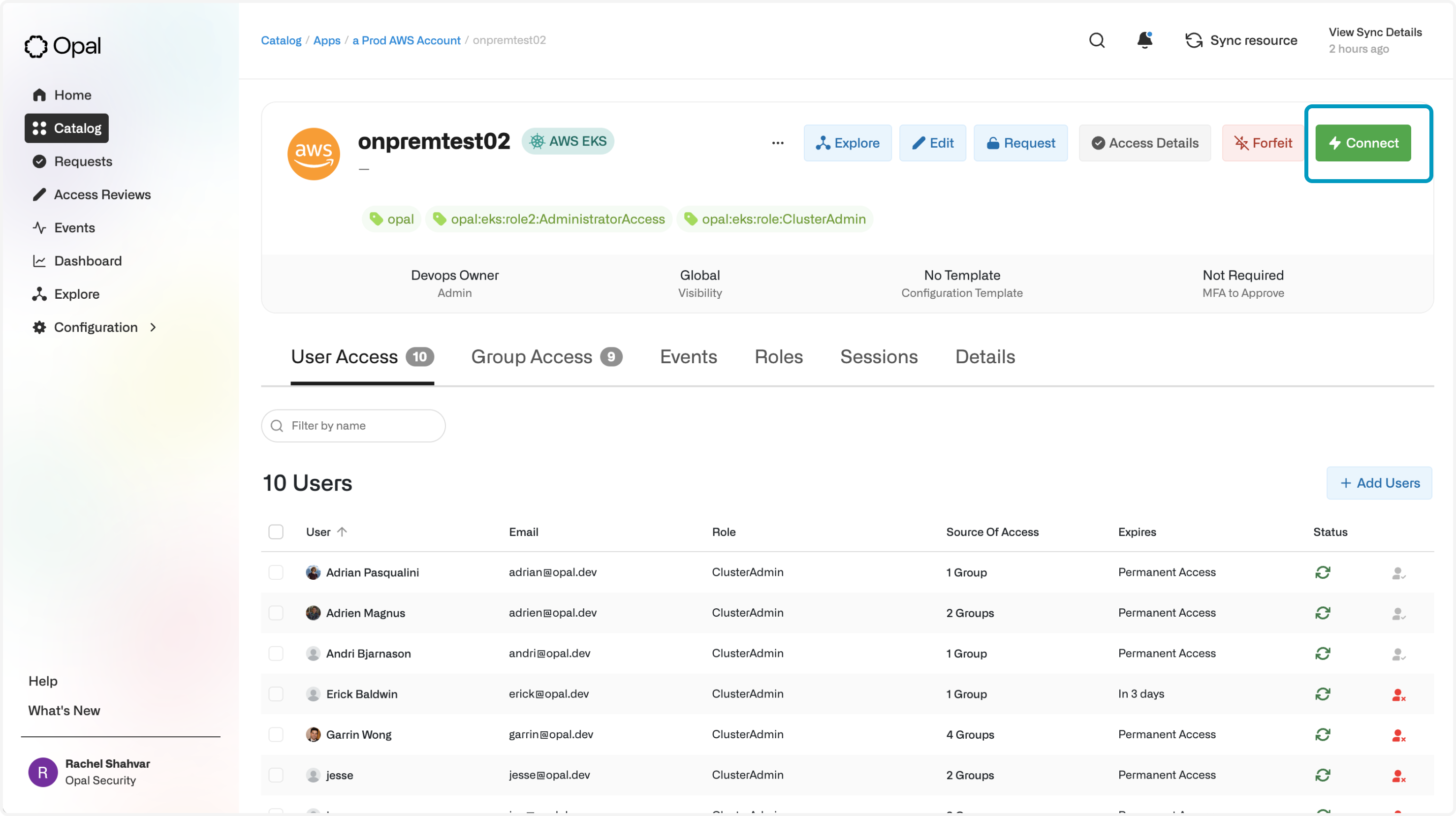 Permissions to EKS clusters are session-based, meaning users must initiate temporary sessions to them. They can do so using the Connect button after clicking into an EKS cluster resource.