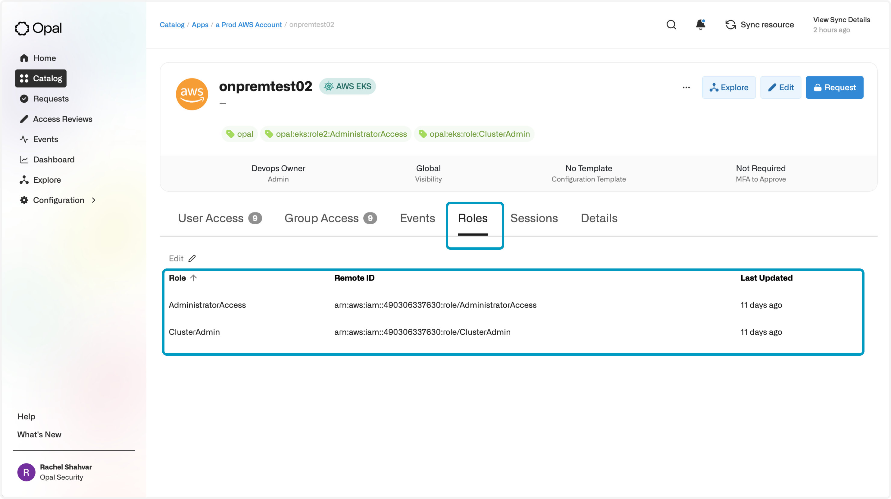 You’ll need to tag your EKS cluster in two ways to properly set it up for Opal. First, you must tag the cluster with any IAM roles that you set up in Step 1. For each IAM role, create a tag whose key is prefixed withopal:eks:role, and whose value is the name of the AWS IAM role. Below, we show an example of a cluster tagged with 2 IAM roles: