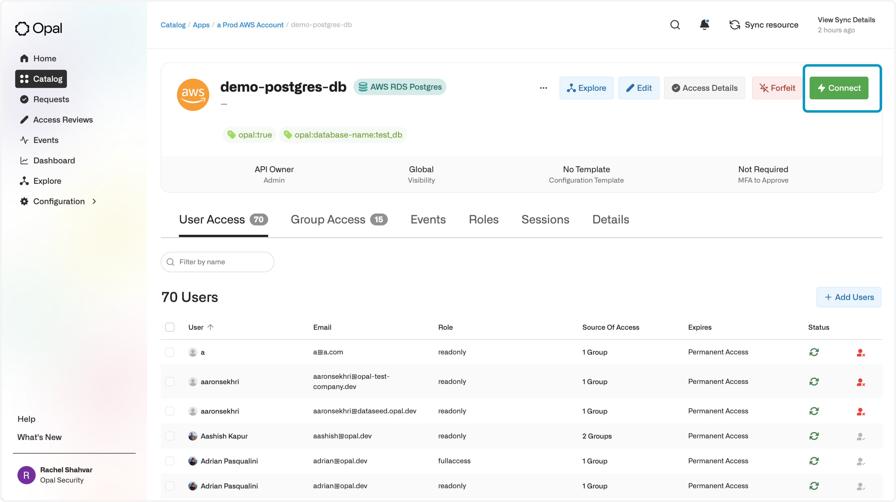 Once you’ve successfully tagged an RDS database, it will appear on the Resources page in the Catalog. If you followed the steps above, you’ll be able to Connect with read-only and full access to your database. Access to RDS databases in Opal is session-based, meaning your developers won’t have access unless they initiate a session.