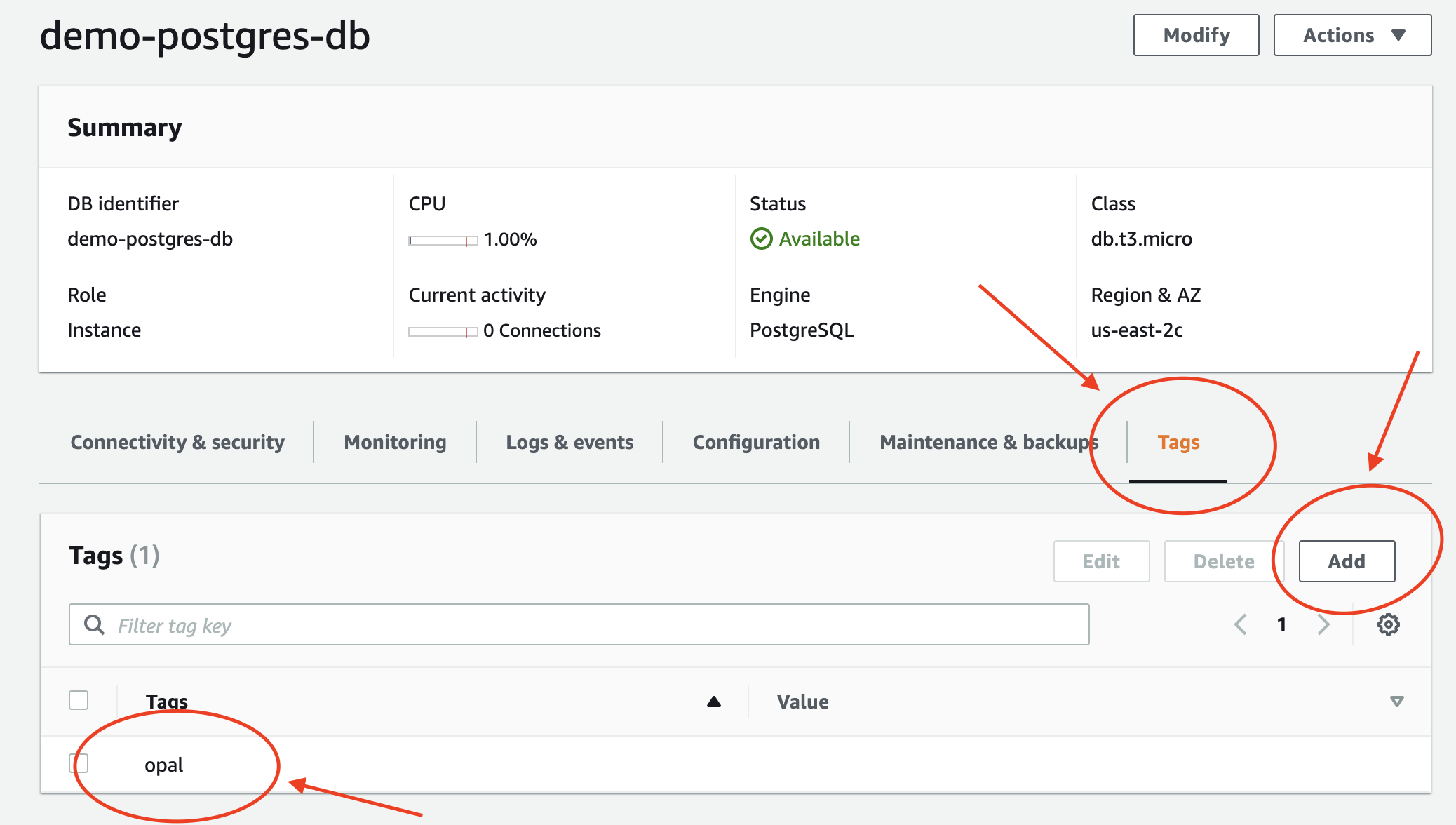 Finally, tag the RDS database withopal so Opal knows which RDS databases you’d like Opal to automatically import: