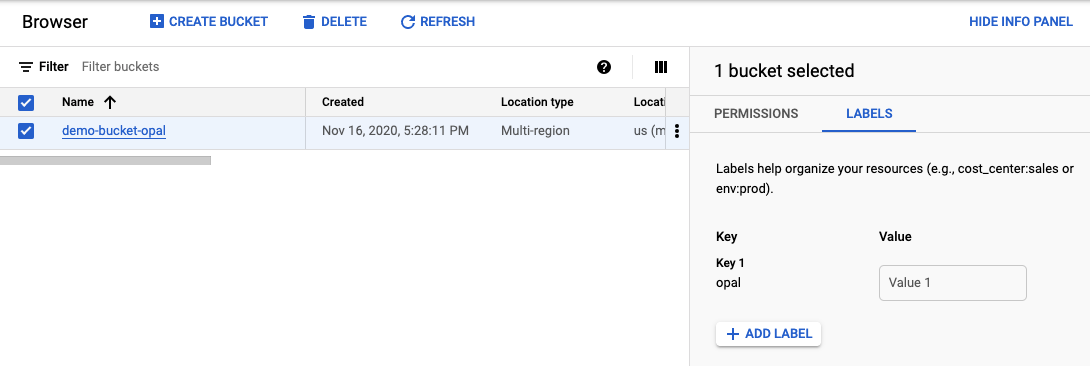 Opal only adds permissions for buckets that you label with Opal. To do this, add a label to your bucket in the Cloud Storage dashboard.