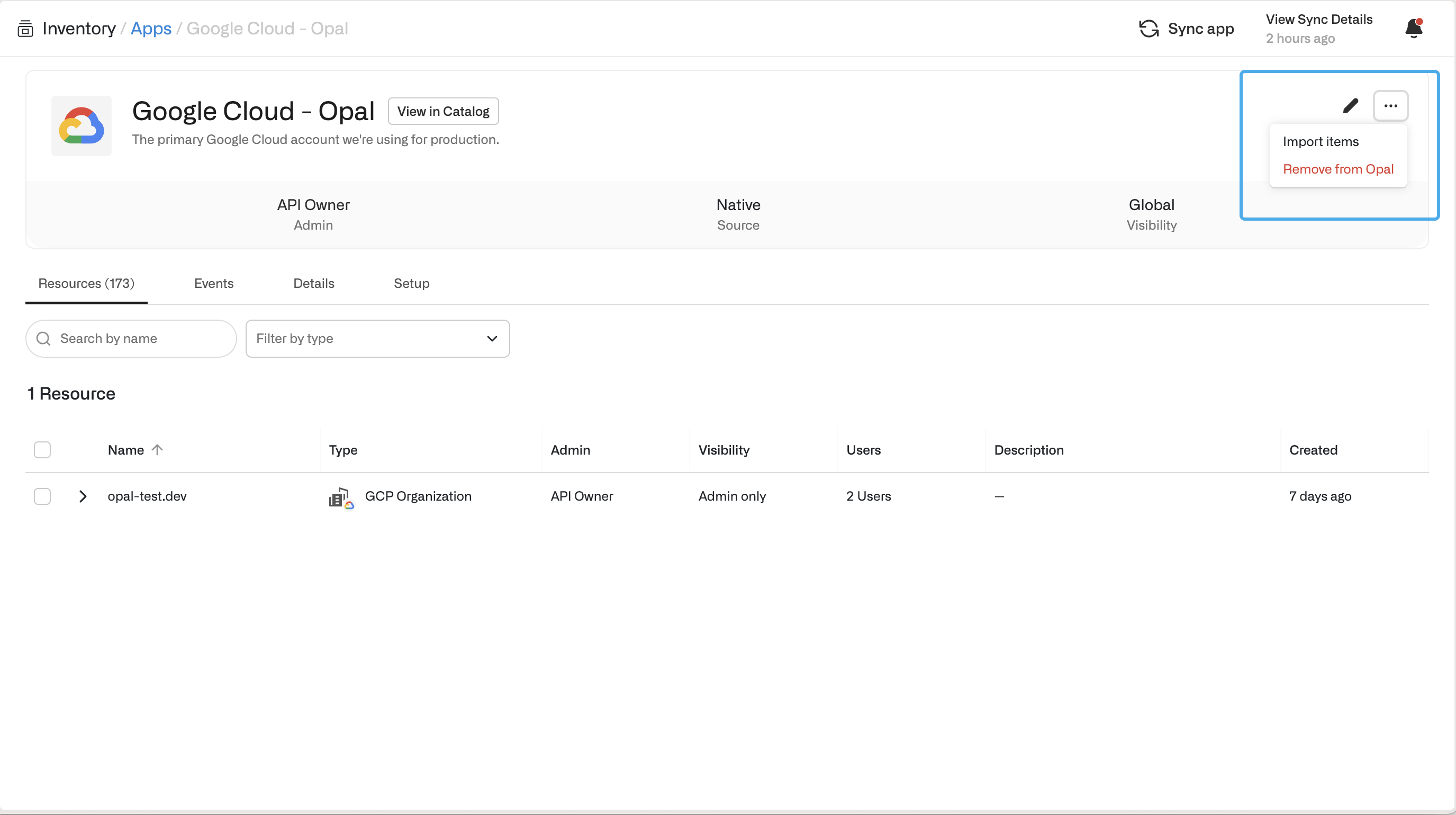 To import organizations, go to your GCP App under Inventory, select Import Items in the top right, and select the GCP Organization resource type.