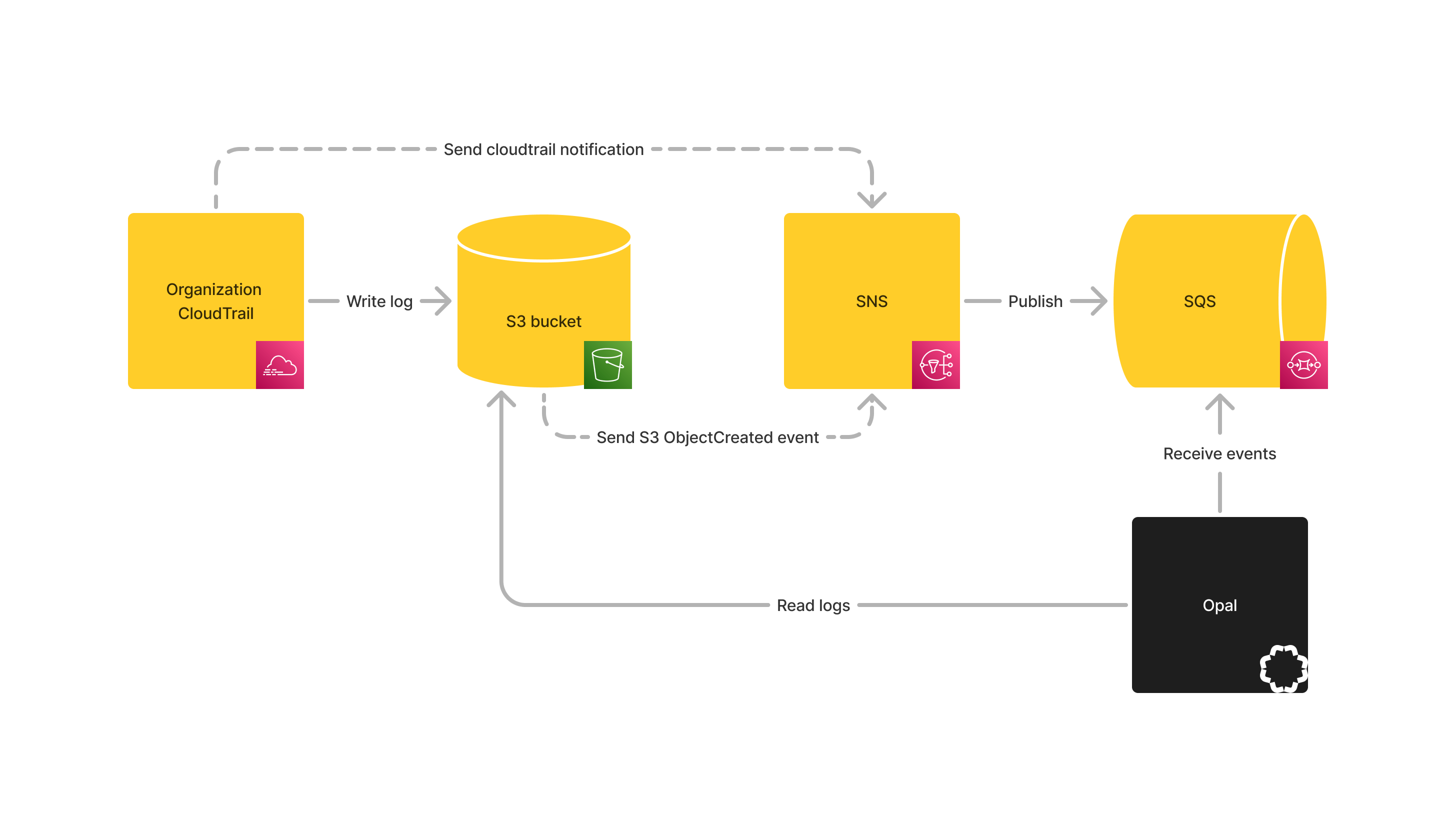 opal_ingester_role_arnandcloudtrail_bucket_arnwith your OpalIngester role ARN and your CloudTrail S3 bucket respectively. - If using an existing SNS topic, ensure that it is already preconfigured to receive “All object create event” notifications. Enter your topic’s ARN on the