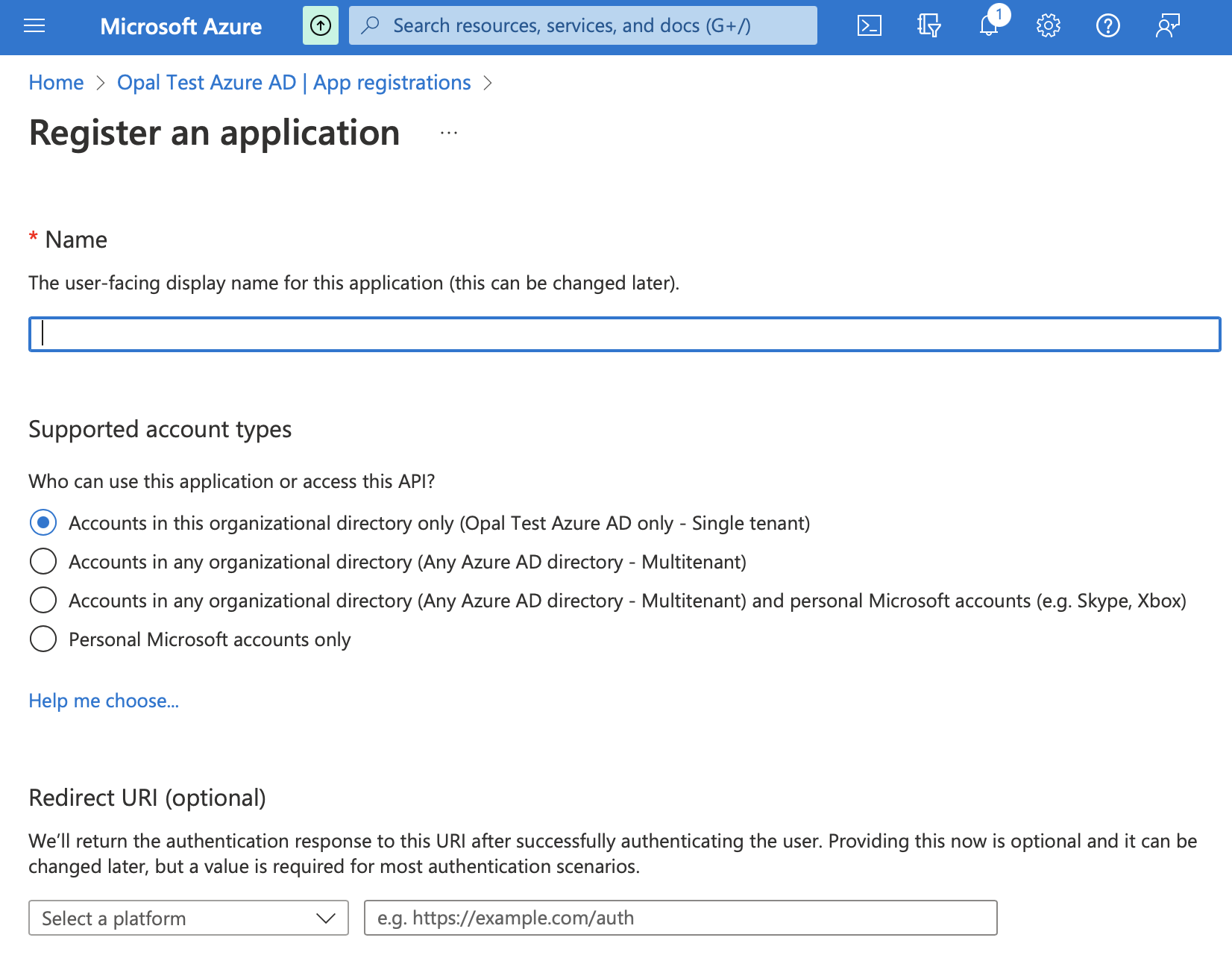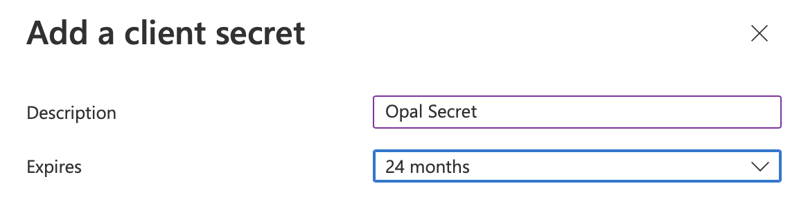 | Redirect URI | If you use a Cloud Opal instance, use https://app.opal.dev/apps/create/azure_ad/callback. If you use self-hosted Opal, https\://<my-on-premise-opal>/apps/create/azure_ad/callback. |
