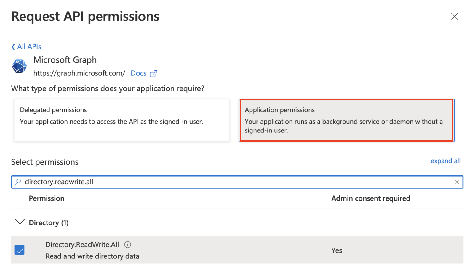 API Permissions and select Add a permission. Choose Microsoft Graph -> **Application Permissions** and add the following permissions: