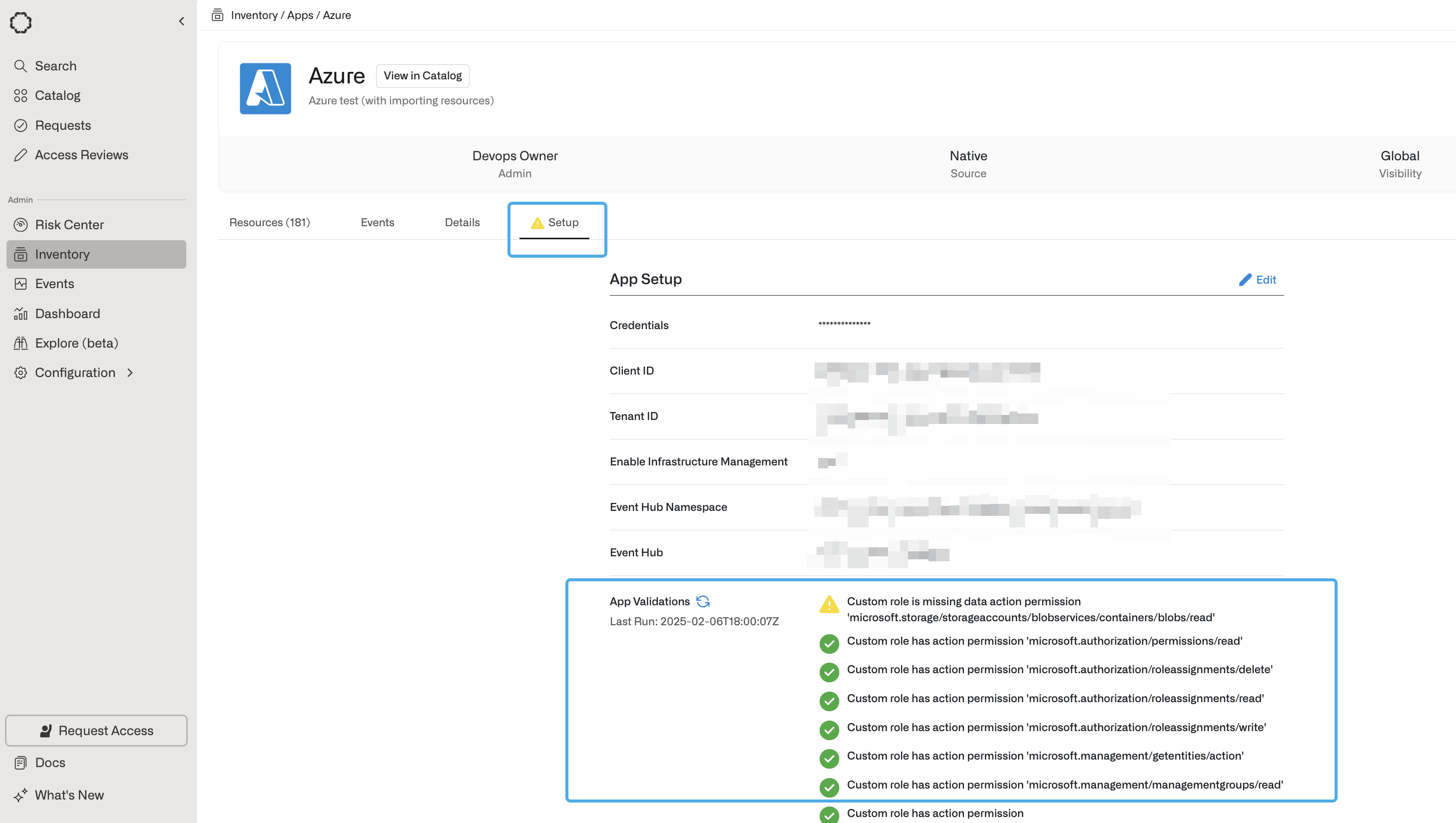 After you save your app, you can view existing sync issues from the Setup tab on the app detail page. Missing permissions and sync issues show in the App Validations section. Select the refresh icon to rerun validation checks.