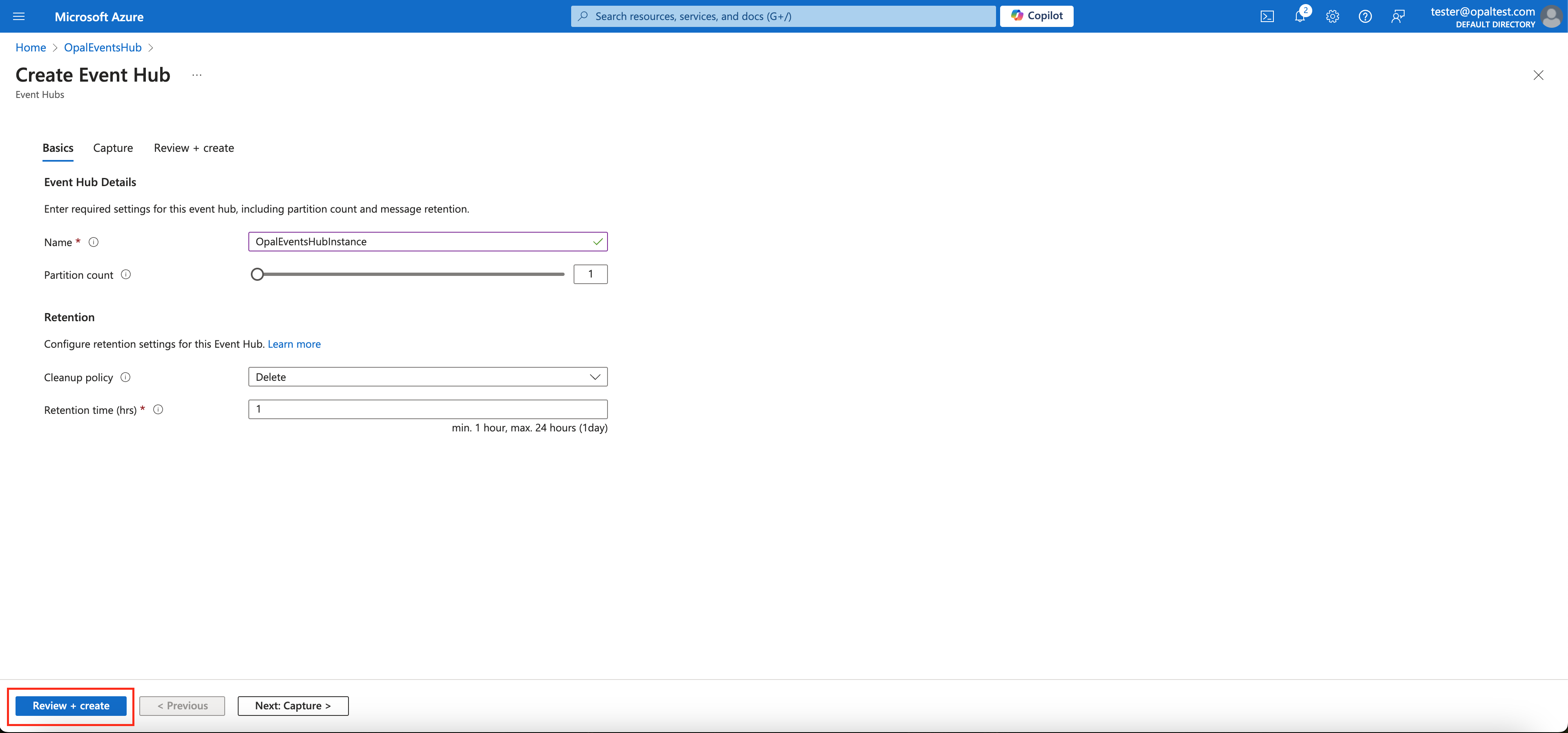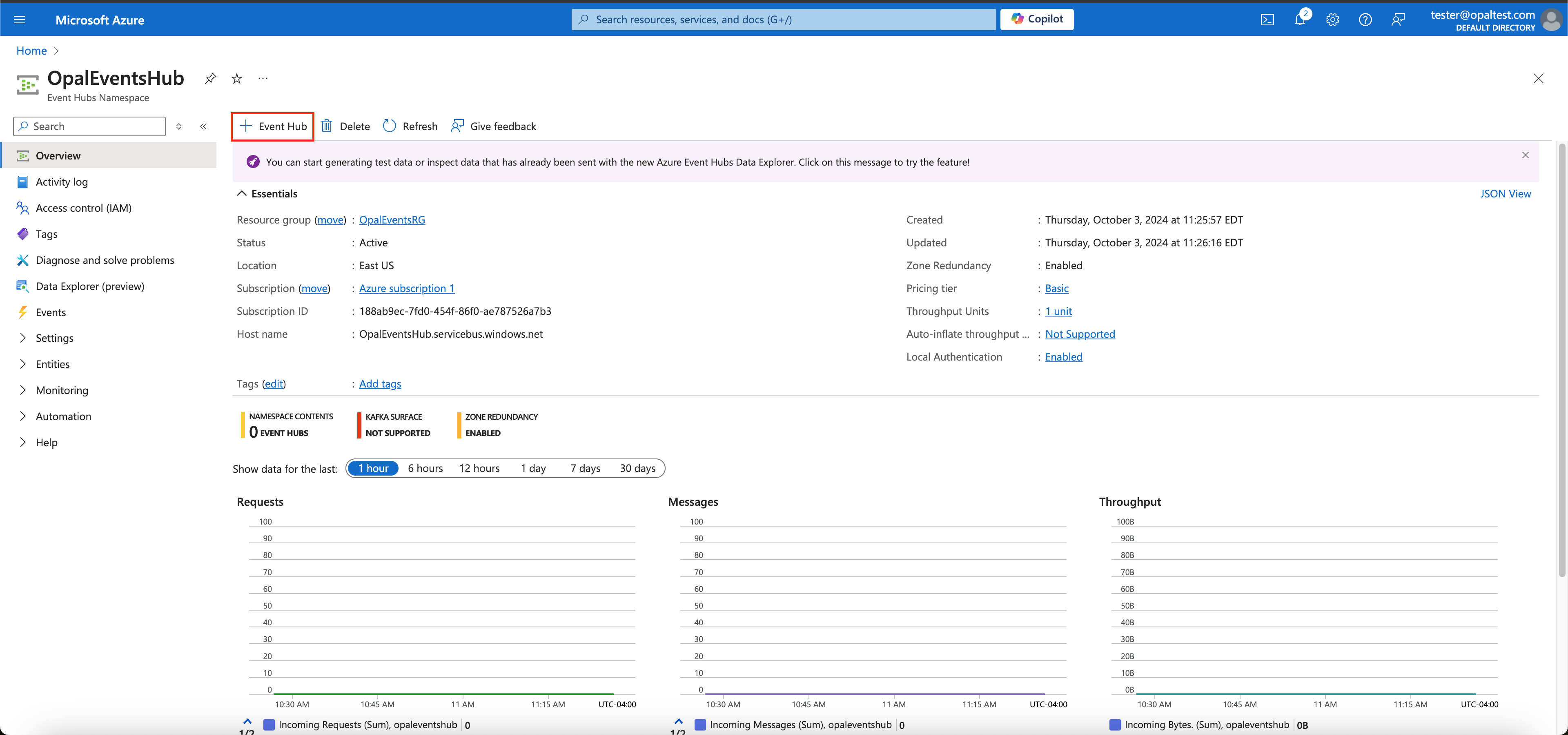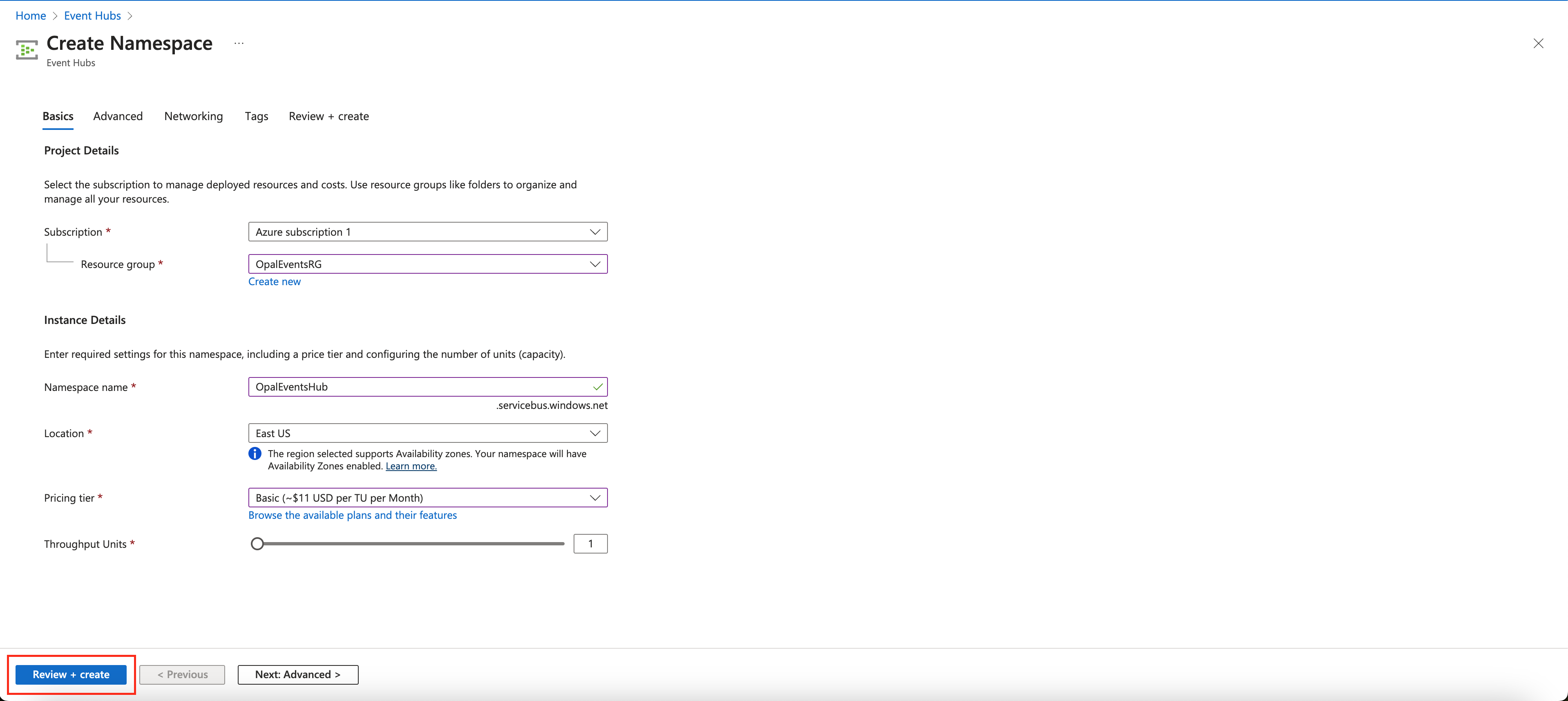Once your event hub namespace is deployed, go to it in the Azure UI and click + Event Hub.