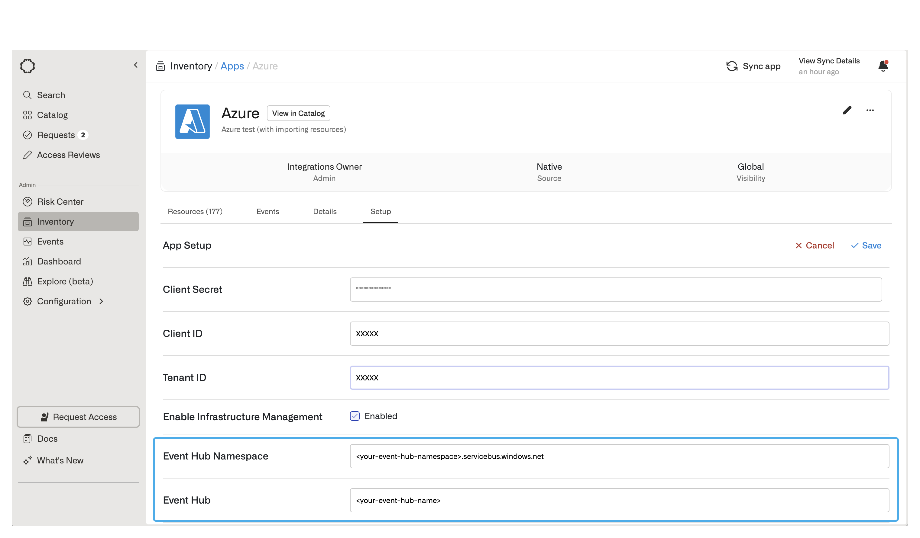 Go to your Azure app in Opal, select Setup and click Edit to configure your event hub:- Event Hub Namespace: This must be the fully-qualified name of your event hub namespace. It will be of the form