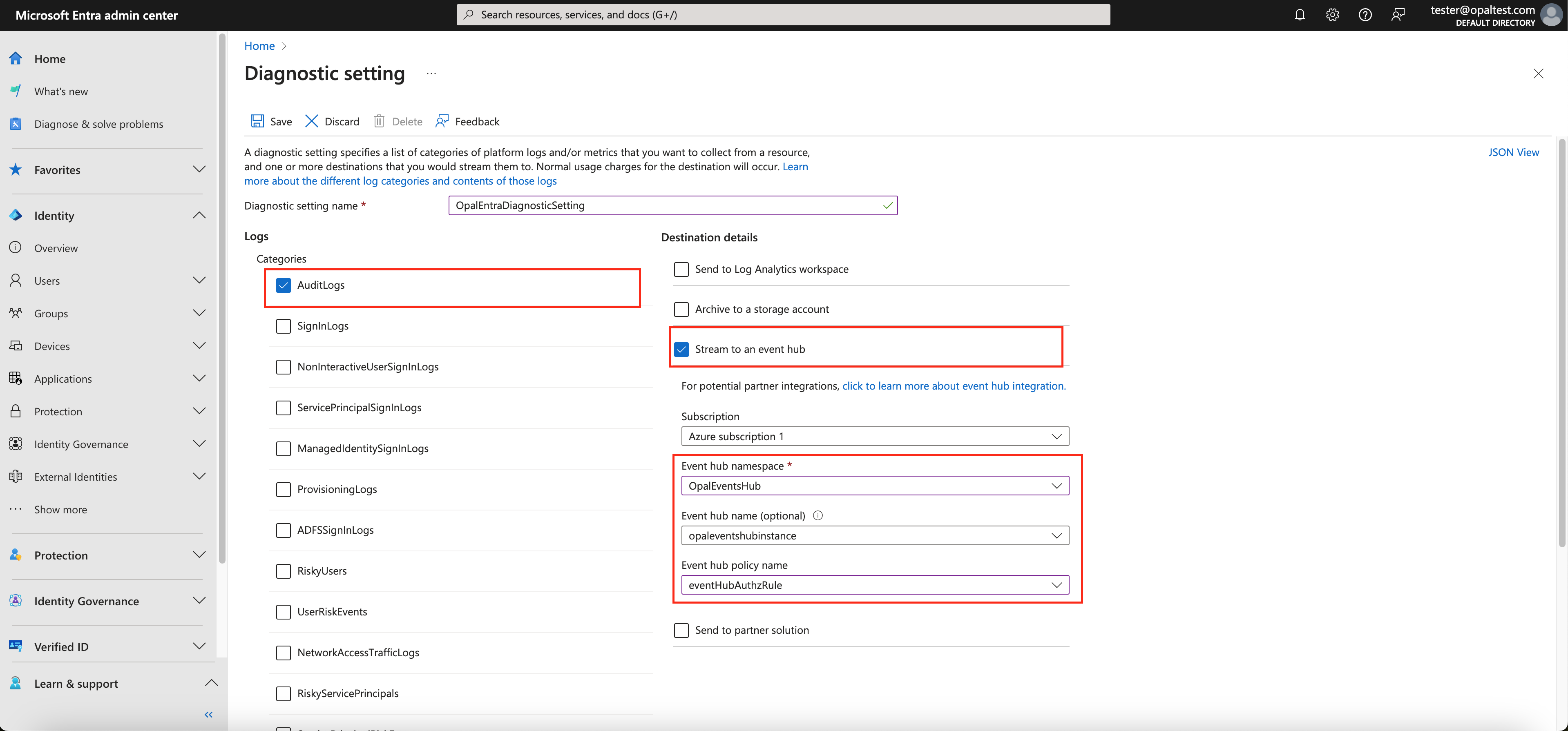 - Log Categories: Select AuditLogs