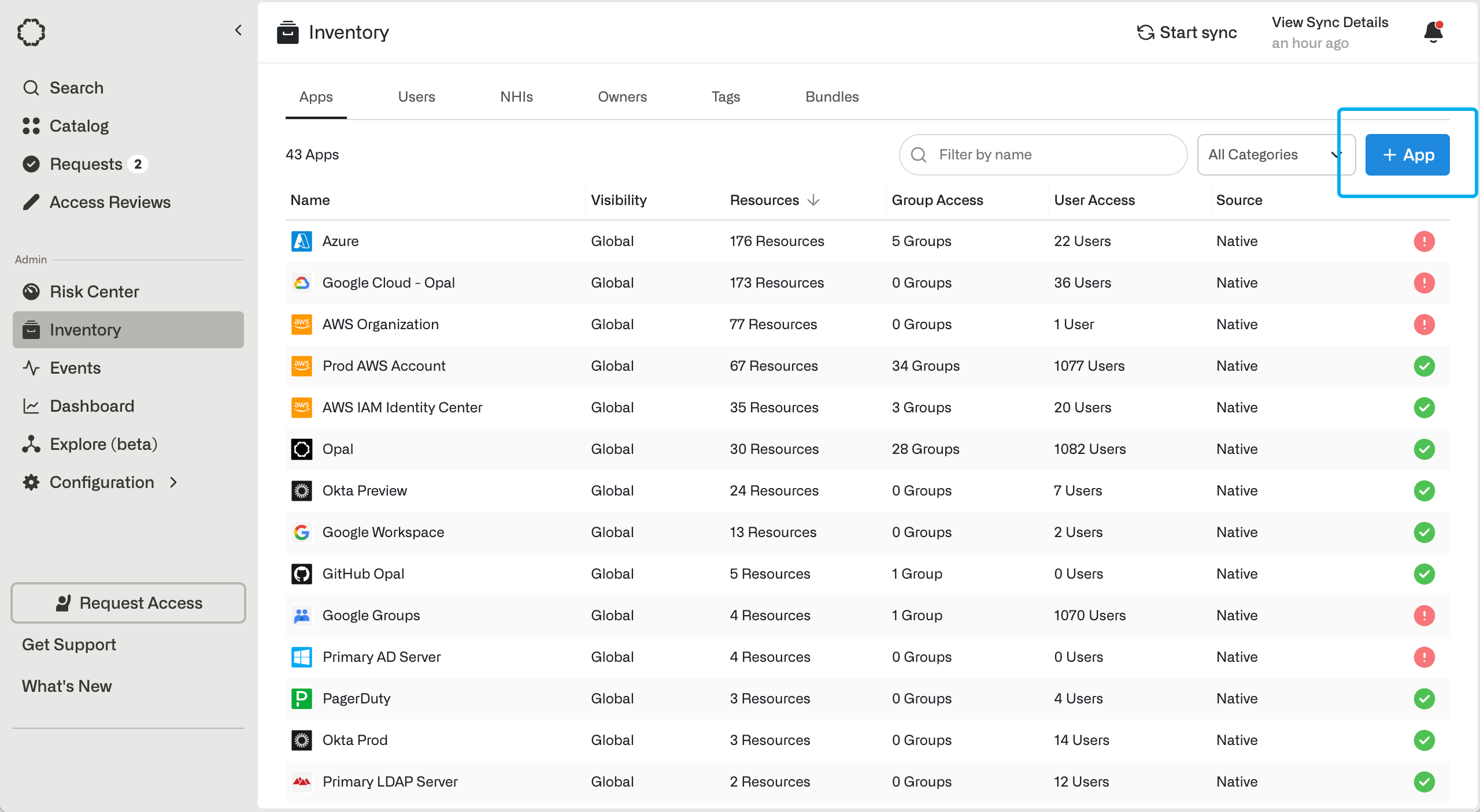 To get started, go to the Inventory page, click + App at the top right. Then, click on the Duo tile.