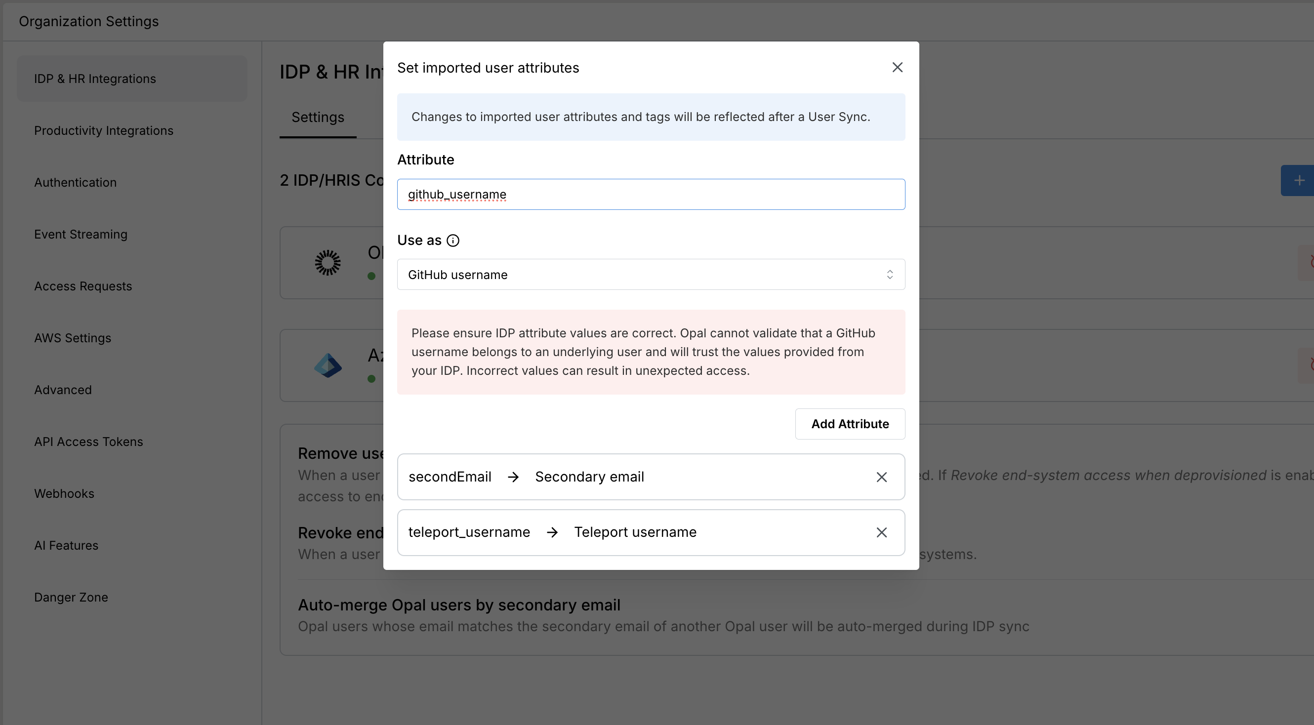 If your end users cannot manually link accounts—e.g., if you’re connecting service accounts to Opal—you can alternatively set the GitHub username as an attribute in your IdP and import it as a user attribute.