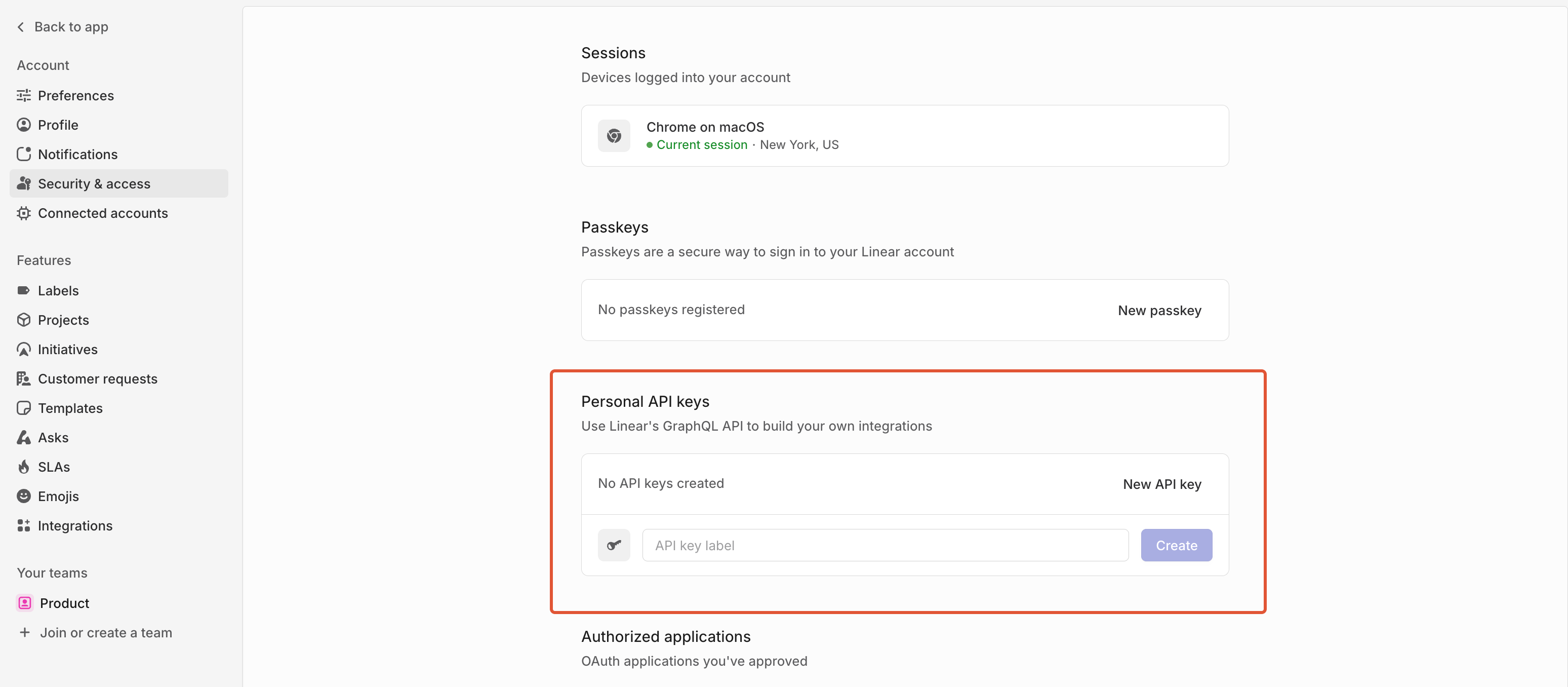 To enable the Linear integration, your Linear workspace administrator should create a Personal API key. Enter a label for the key, click Create Key and save the generated key. You’ll use it in the following step.
