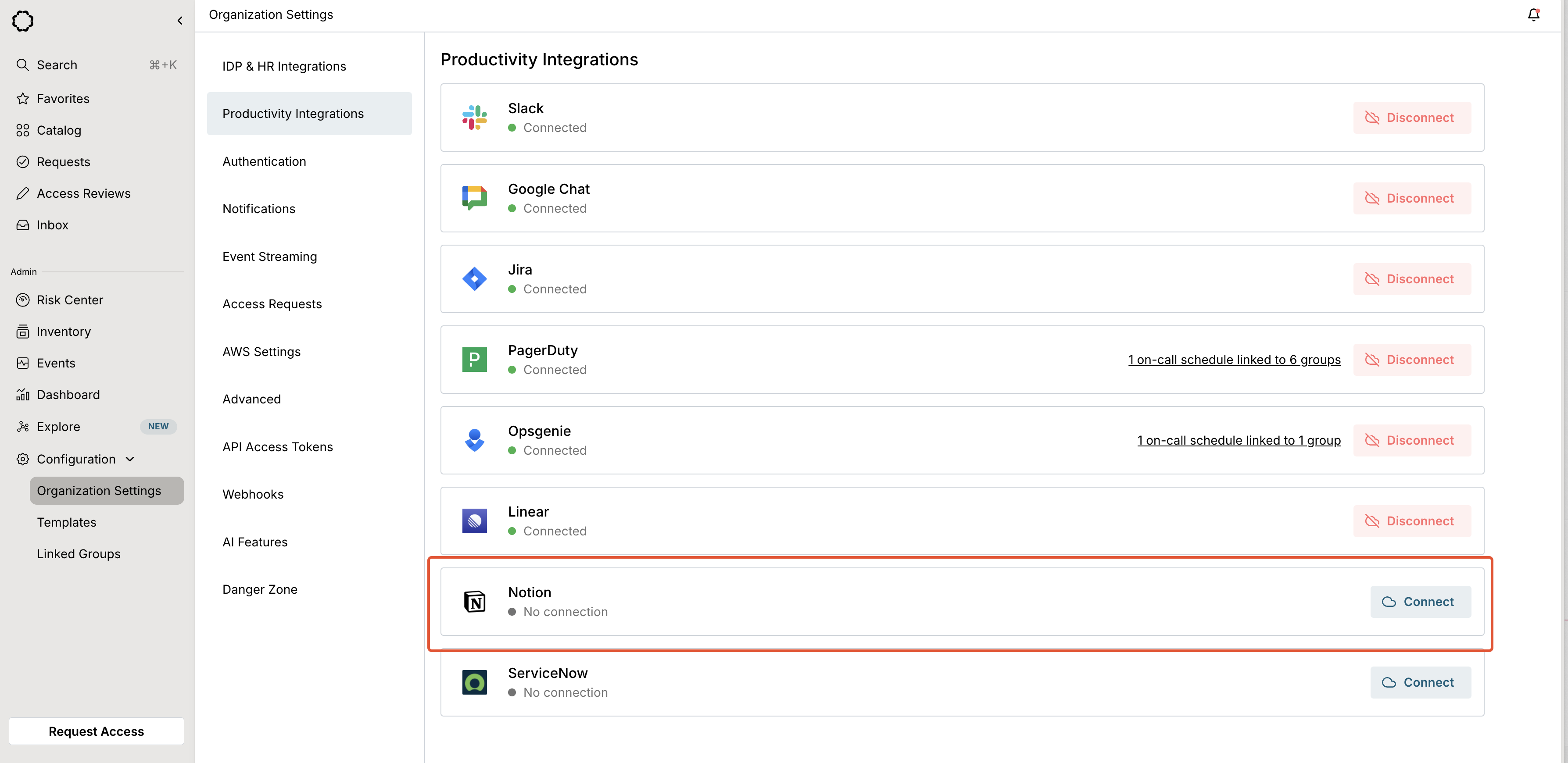 In Opal, go to Configuration > Organization Settings > Productivity Integrations and select Connect next to Notion.