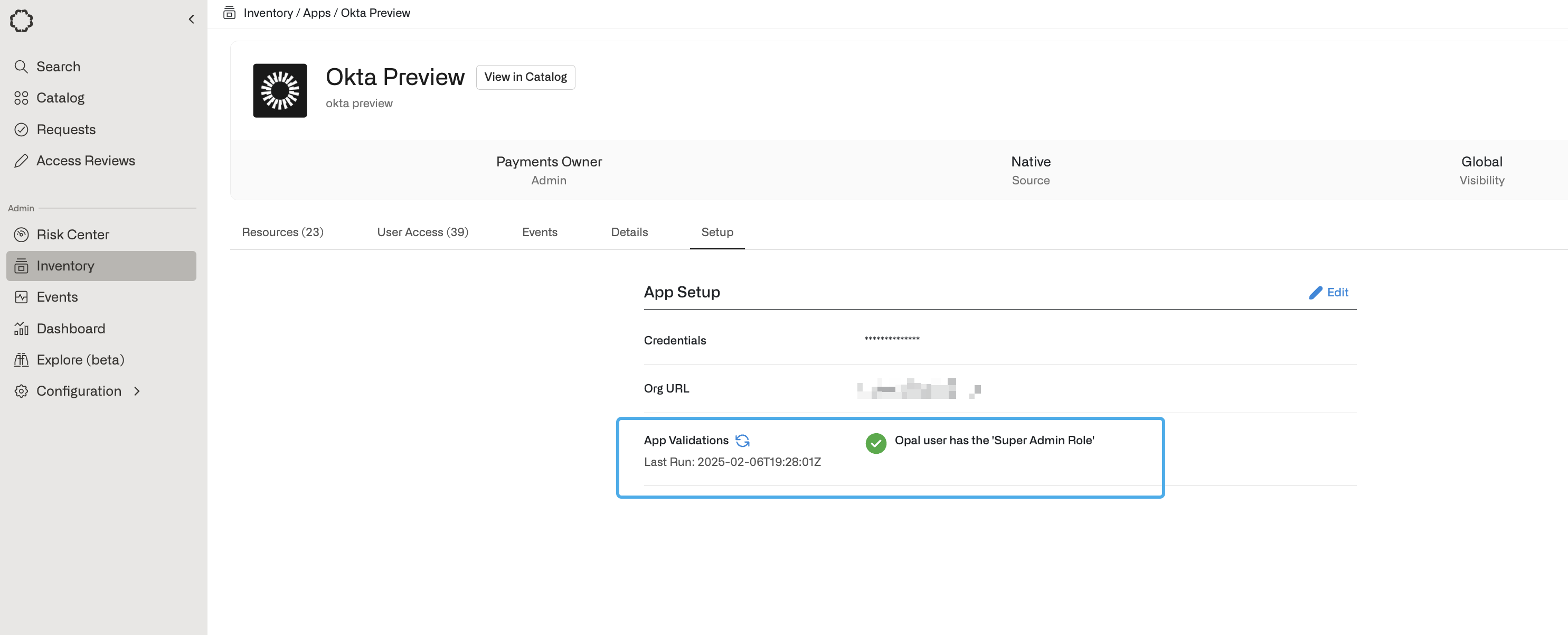 After you save your app, you can view existing sync issues from the Setup tab on the app detail page. Missing permissions and sync issues show in the App Validations section. Select the refresh icon to rerun validation checks.