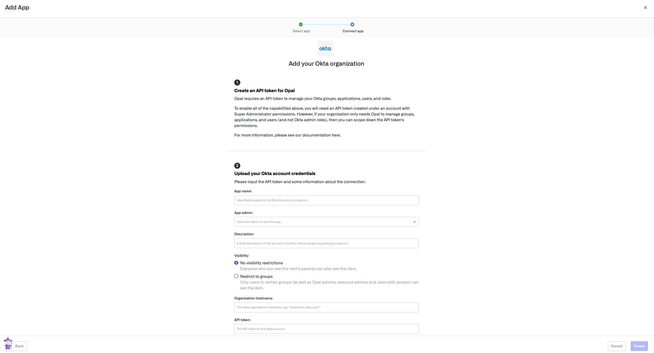 Back in the Opal New App form, fill in details about your Okta organization:- Organization hostname: enter the URL hostname of your Okta organization (e.g. “mydomain.okta.com”)