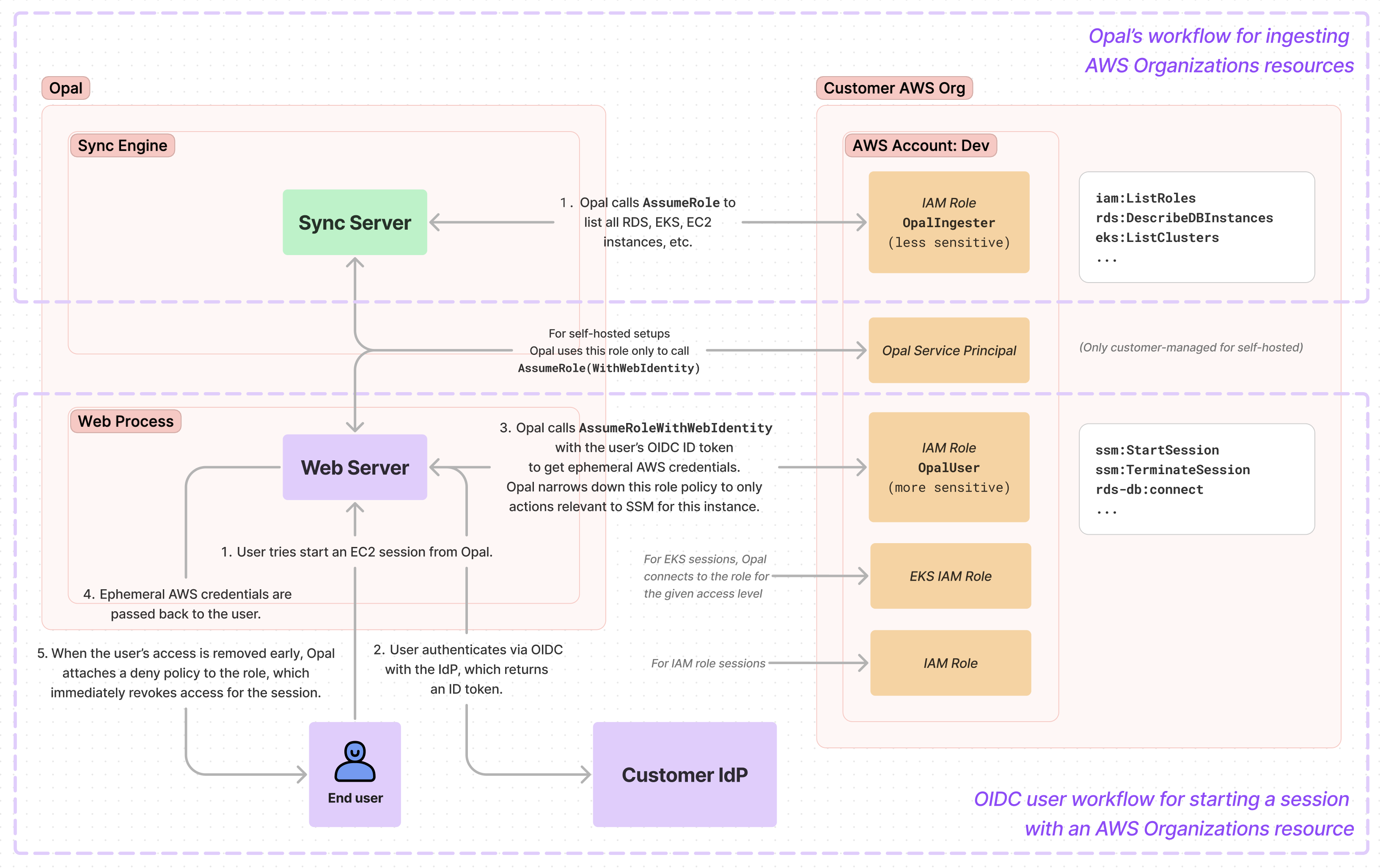 The following shows a high-level summary of how Opal authenticates for two major workflows:- Synchronizing your AWS Organizations resources in Opal
