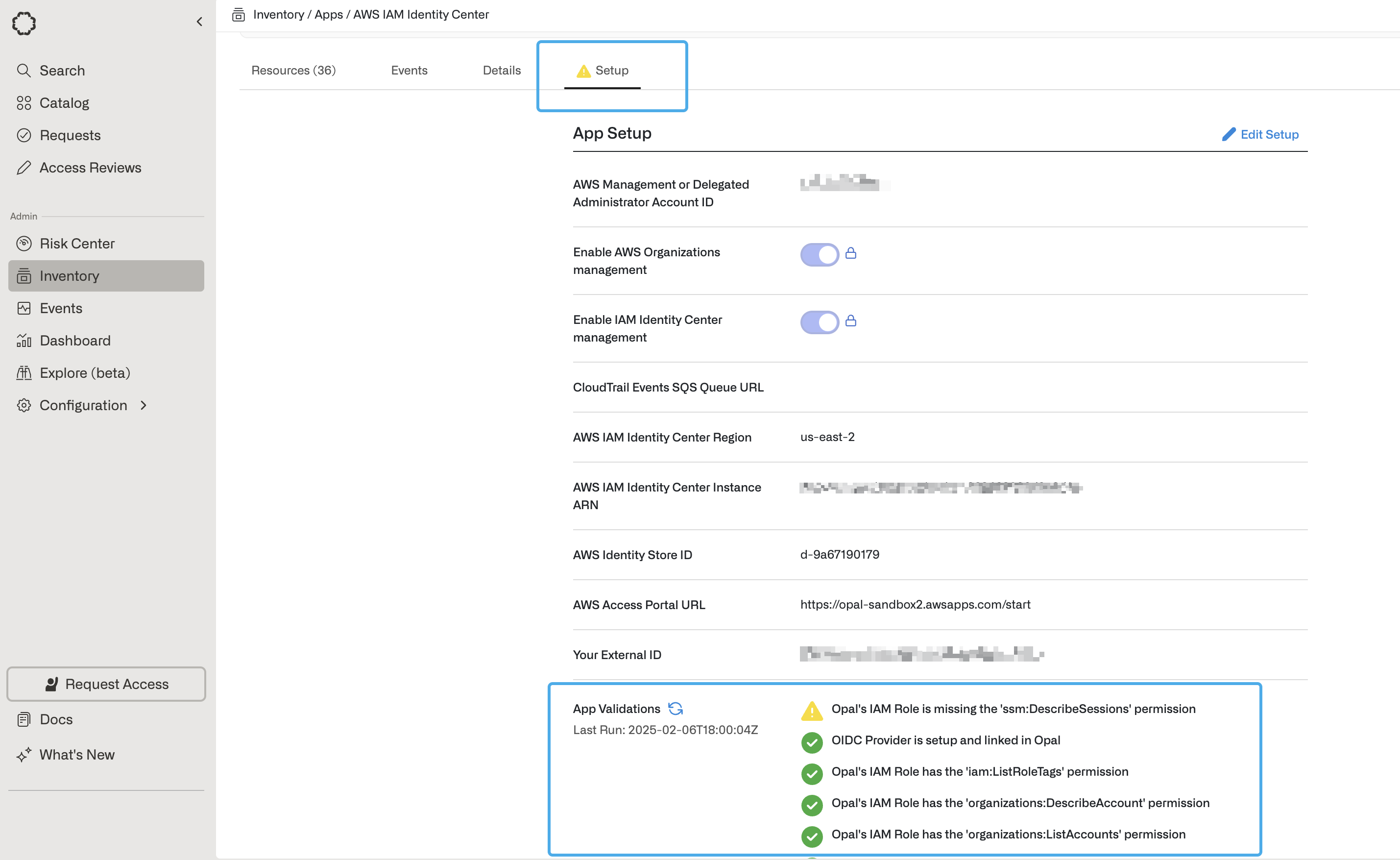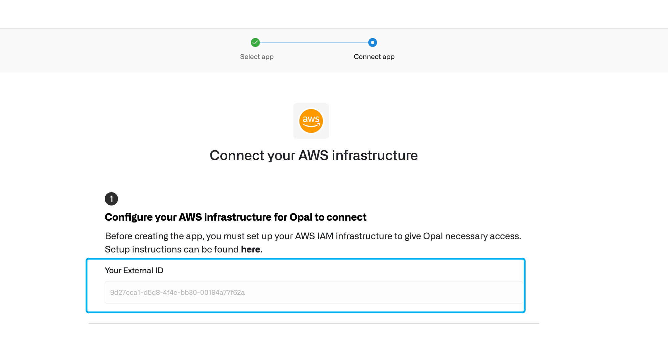 - Save the External ID, which is unique to your Opal organization and is necessary for the following step. Opal uses this to safeguard Opal’s third-party access to your data.